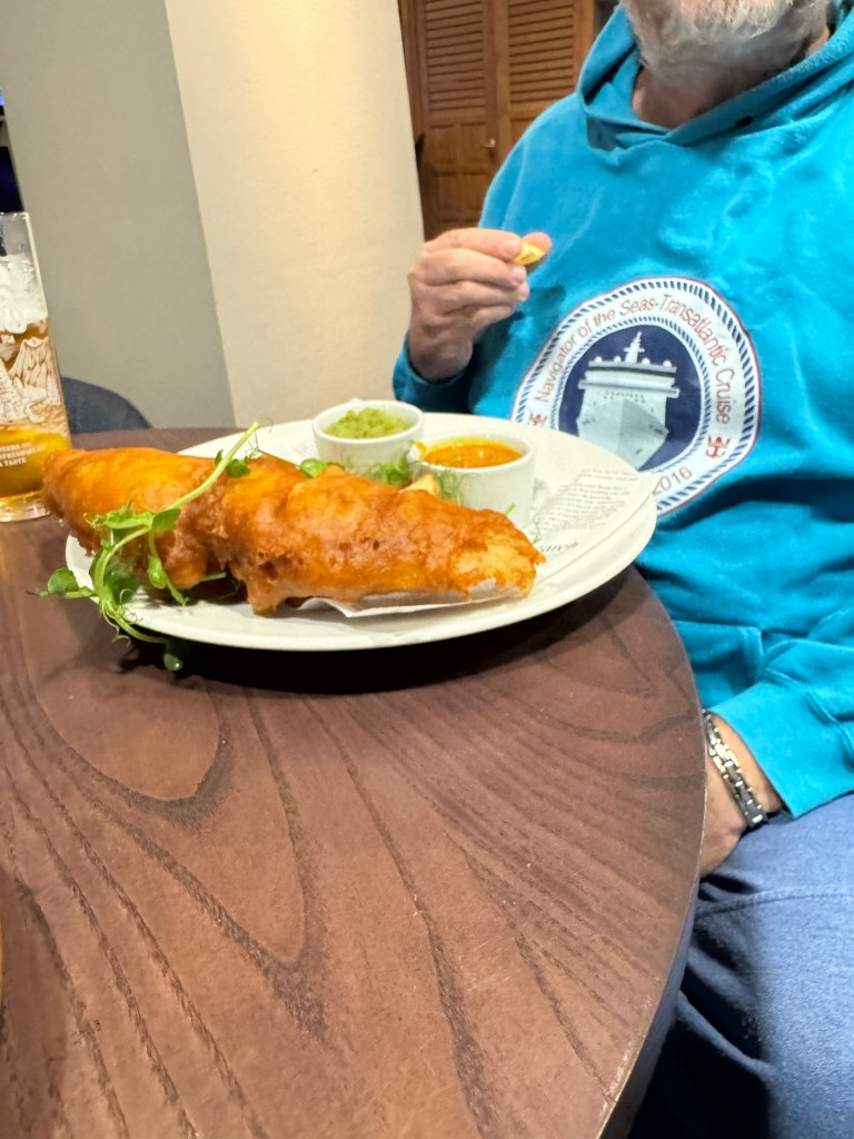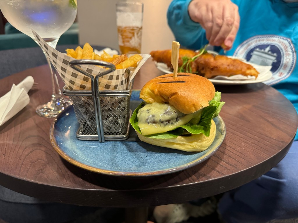Around 17:00, we headed down to the bar for an early dinner. Graham had a beer and some fish and chips with mushy peas and curry sauce. I had a gin and tonic and a cheeseburger with fries. It was a great burger, too.