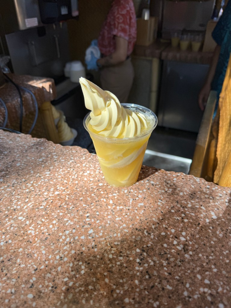 Near the exit of the ride, Pete was meeting and greeting, and I was very tempted, but I am not sure how quickly the line was moving, and I had a mobile order window coming up . I made my way towards Adventureland. As I crossed the hub, I got an alert that the window for my mobile order had opened even though it was still 15 minutes until the time I had chosen. I did not mind this at all. I crossed over into Adventureland and when I was within sight of the Tiki Juice Bar, I confirmed that I was there. A couple of minutes later, I got another message telling me that my order was ready. I picked up my Dole Whip float and this was as good as I remembered. It was also very refreshing.