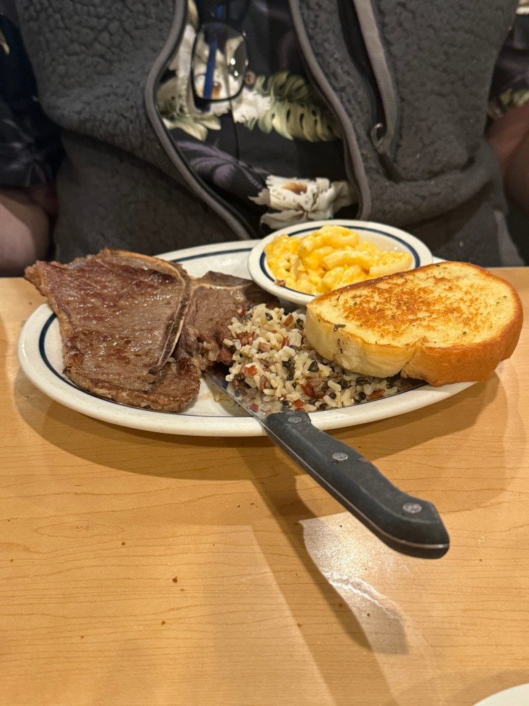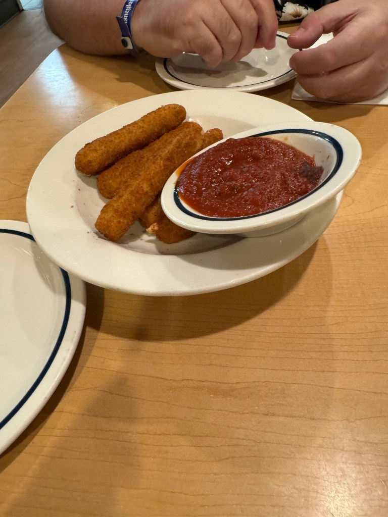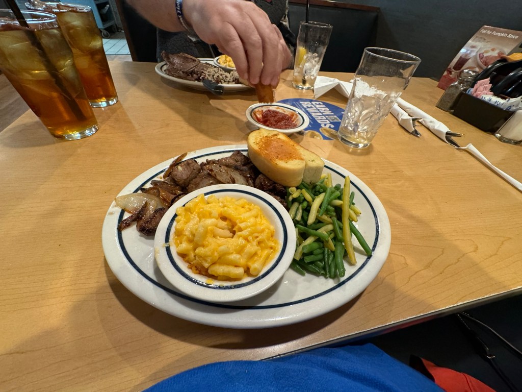 We decided to go out for dinner before we became too comfortable. We walked through Downtown Disney and past the park entrances to the IHOP that is just across the road from Disneyland. We were seated straightaway. We shared some mozzarella sticks with marinara sauce. We both had some mango iced tea, which was delicious. Graham had the T-bone steak with the sharp cheddar mac & cheese. He had also wanted some broccoli, but they did not have any. Instead, he had the mixed rice pilaff. I had gone with sirloin steak tips sautéed with grilled onions & mushrooms. I also had the sharp cheddar mac & cheese and for my second side, I had gone with the bean medley. We enjoyed our dinner, but IHOP is no longer a cheap place to eat. In the end, this was the most expensive meal we had on this trip. Indeed, it was cheaper to eat at the Disney restaurants than at the IHOP.