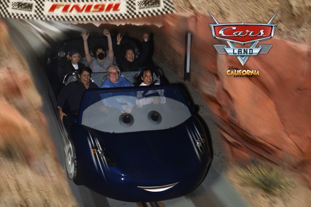 When we had finished our dinner, our window for Radiator Springs Racers had opened and we headed over to Carsland. By then the sun had gone down. It is pretty cool to do the ride in the dark. This time, we went down the body shop side again. We did not win the race, but we had fun.