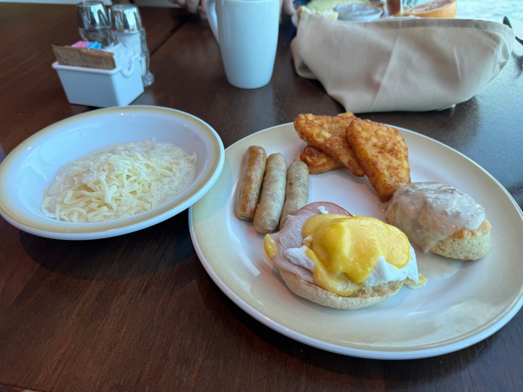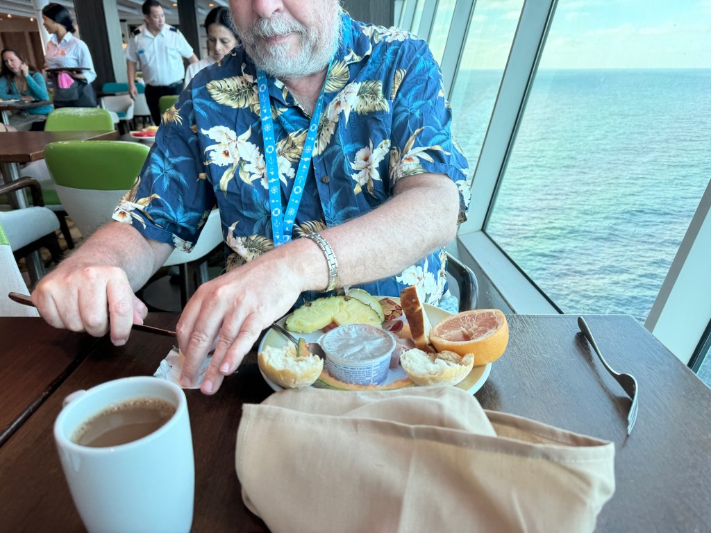 We were both awake at 6:30. We got up and ready and then checked out breakfast options. We figured that the best option would probably the Windjammer. As soon as it opened for breakfast at 7:00, we headed up there. There were not many early risers and we ended up with a table with a view. Graham had a roll with cold cuts, some sweet yeast bread, fruit, and yoghurt. I had pork link sausages, eggs Benedict, biscuit and gravy and hash browns. Eggs Benedict can be decidedly hit and miss on Royal Caribbean, and it was definitely a big miss on this ship.