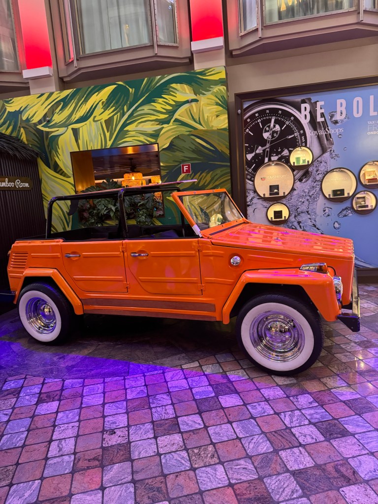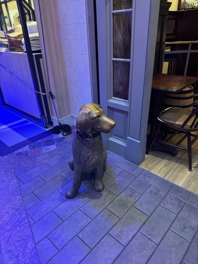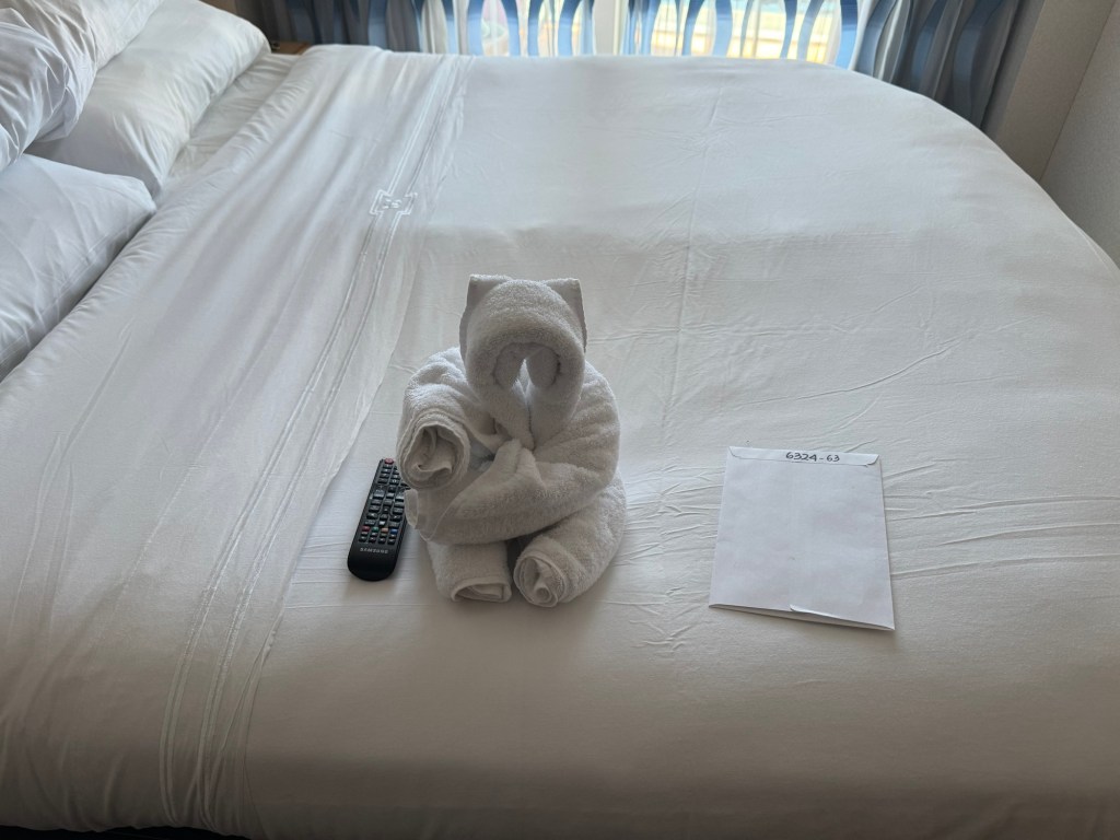 I took my goodies back to the cabin. Our stateroom host had already made up our cabin and had left us a towel animal. I took a quick photo, grabbed a layer and then I headed out again. It was still surprisingly quiet on the Royal Promenade. I grabbed this opportunity to take some photos. There used to be a bronze dog statue near the entrance of the Windjammer when we did a transatlantic cruise on Navigator in 2016. We had a lot of fun with this, because every day, the statue wore a different costume. I had missed this statue the day before as it was no longer guarding the Windjammer. However, it had just been moved and was now outside the pub, but unfortunately minus costumes. I also took a photo of the car on the Royal Promenade. Every Royal Caribbean ship that has Royal Promenade, has a car in this area. When we sailed on this ship in 2016, there was a gorgeous red vintage car. This had been replaced with an orange jeep. As this is outside the tiki bar on this ship, it kind of fits, but it is still a shame that the old car has been removed. I also took a photo of a huge cake just outside the Café Promenade. It was Remembrance Day that day, which is observed as Veterans Day in the USA. They were setting up for an event to recognize this. I moved on swiftly as I did not want to get tangled up with this.