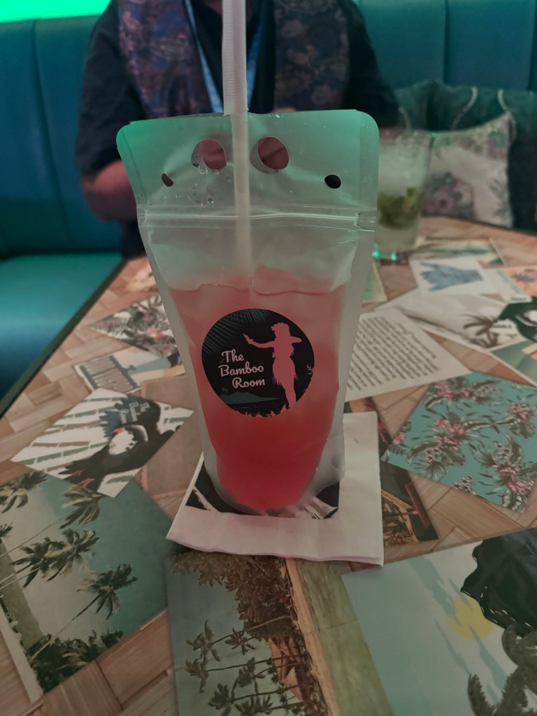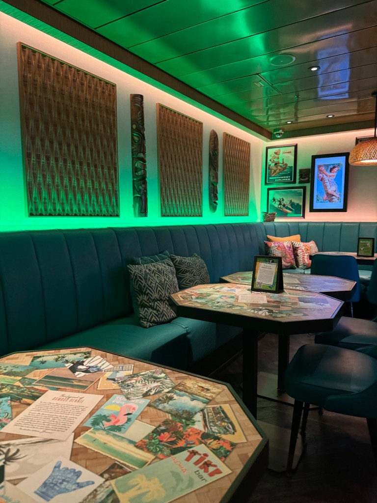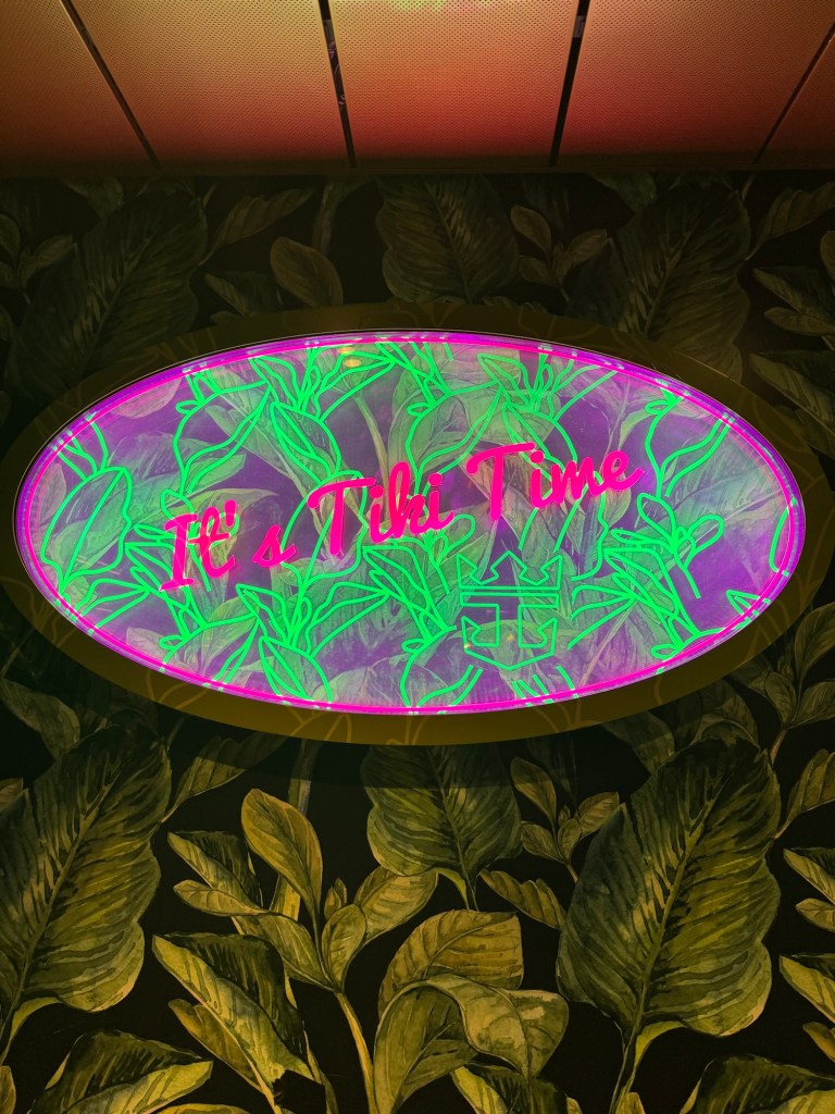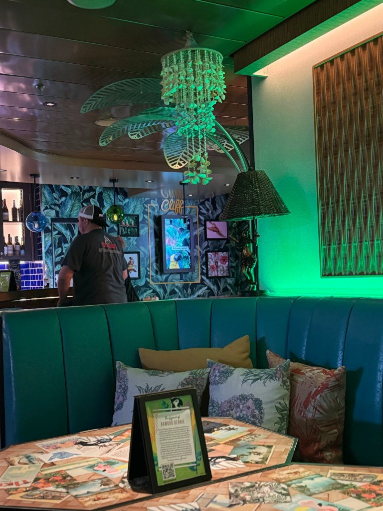 After trivia, we went to the Bamboo Room for a pre-dinner drink. This was one element I was the most excited about on Navigator. When Navigator had the big makeover, they added the Bamboo Room to the Royal Promenade. This is a tiki bar with some unique cocktails. The cocktail that I was the most excited about is called On The Run. This is lovingly referred to as adult Capri Sun as it is served in a clear pouch with a straw. It consists of Bacardi Superior rum, watermelon juice, lime juice, guava syrup, St. Elizabeth Allspice Dram, and mint. I love everything with watermelon, and I figured it would be a hit. It was not what I had hoped. It was not that it was unpleasant. It just was nothing special and not worth the upcharge. The signature cocktails at the Bamboo Room are considered premium cocktails and are a bit more expensive than what is covered by the drinks package or the drinks coupons. I would not have minded at all to pay the difference a few times if the drink had wowed me, but there were nicer drinks available on the ship that were fully covered by our drinks’ coupons. Graham had a mojito, which was covered by the drinks’ coupon. He enjoyed this. He was not too keen on the venue though. It was quite dark and somewhat strange. This remained our only visit to the Bamboo Room.