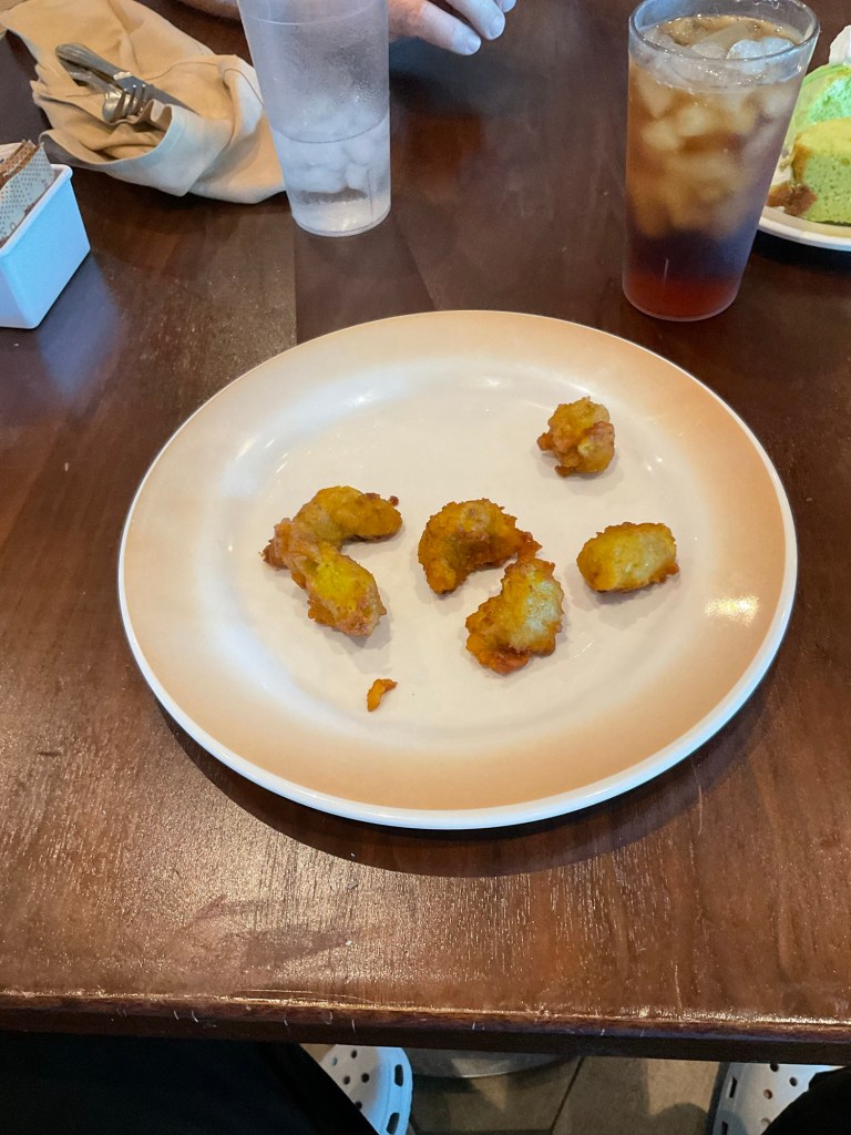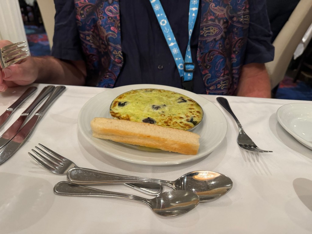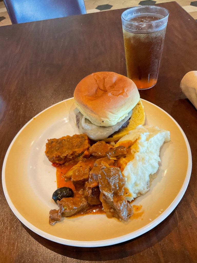 Around 12:00, we briefly went back to the cabin to drop off our stuff and then we went up to the Windjammer for some lunch. Graham was being else again. He had all kinds of salad vegetables, cold cuts, and some bread. I had some beef and olive stew, mashed potatoes, and vegan meat loaf. I usually like vegan or vegetarian food and as meat loaf is one of my favourite dishes, I had high hopes for this. This ended up being one of the worst dishes I have ever tasted. Both the texture and the flavour were awful. The rest of the food was however delicious. One thing that I loved on this ship is that they had a burger of the day. That day it was a French onion burger. This was juicy and delicious. Once I had finished my main course, I went to check out the dessert situation. They normally have a hot dessert every day and Graham usually likes those. There was no hot option with the desserts on that side. Sometimes they have a different dessert station on the other side and usually only one of the dessert stations has the hot option. Graham was out of luck. However, something caught my eye as I walked past the area where they had the burgers on that side. They had hush puppies, which is something I have always loved, but have not had in ages. I had to have a few of them. They were as nice as I remembered. The biggest surprise however was dessert. Their pound cake is a running joke in our house. I actually quite like it as it has a beautiful texture, but whatever flavour it is meant to be, they all taste the same. The only thing that normally changes is the colour. The only indication that the pistachio pound cake is meant to be pistachio is that it is bright green. Imagine my shock when I had some that day and it actually tasted of pistachio. I had every intention to have another slice later in the day, but I never got around to this.