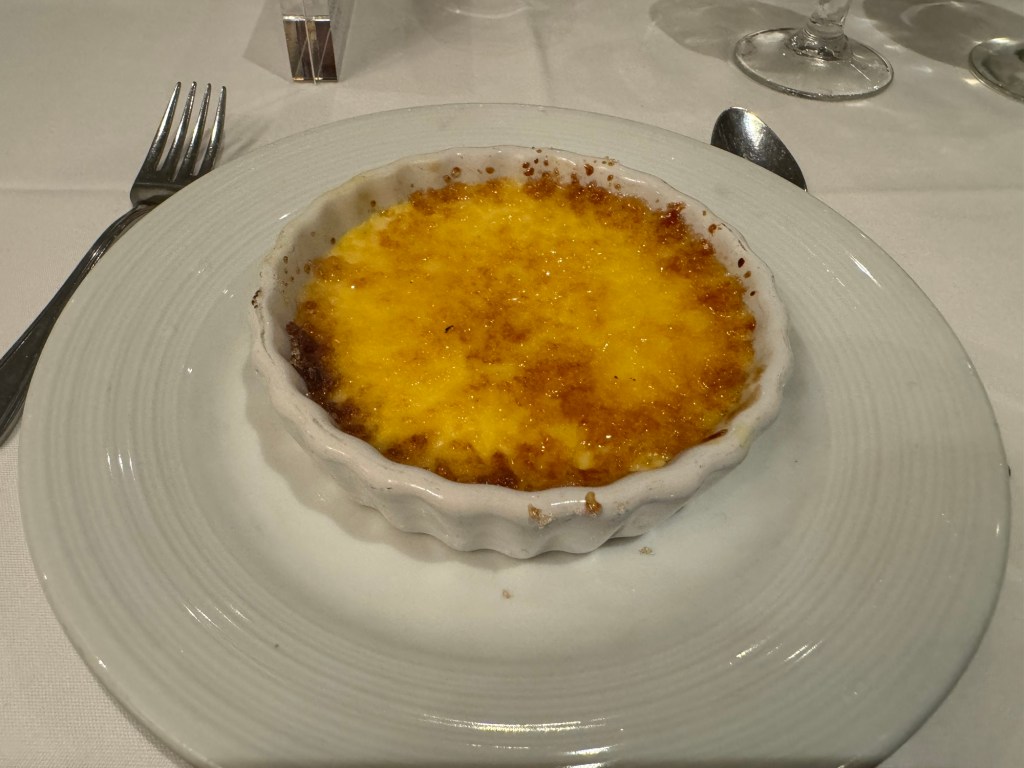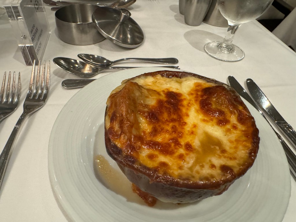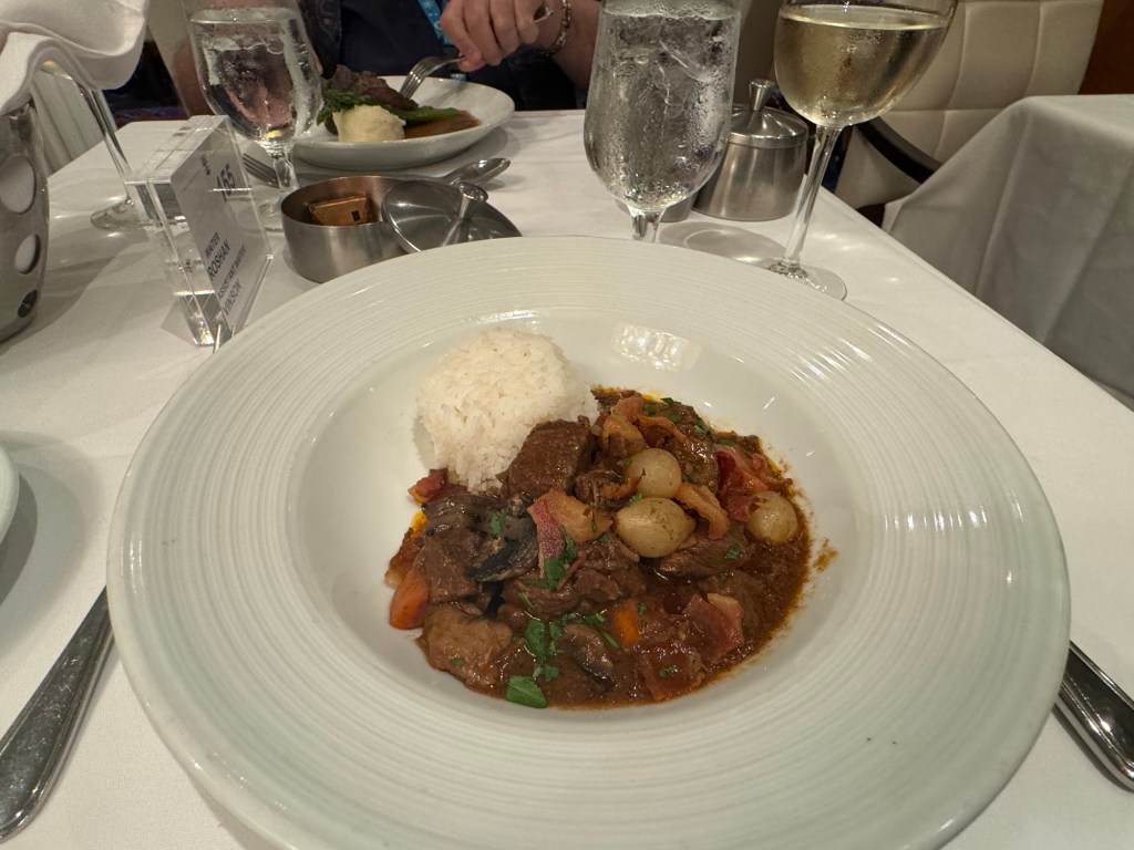 The menu that evening was A Taste of France. Graham started with the escargot, and I had the French onion soup. For his main course, Graham went with the beef tenderloin, mashed potatoes, asparagus, and peppercorn sauce. I had the beef bourguignon, which came with rice. For our dessert, we both had the crème brûlée. Everything was lovely as was the Chateau Ste. Michelle Riesling that we had with dinner.