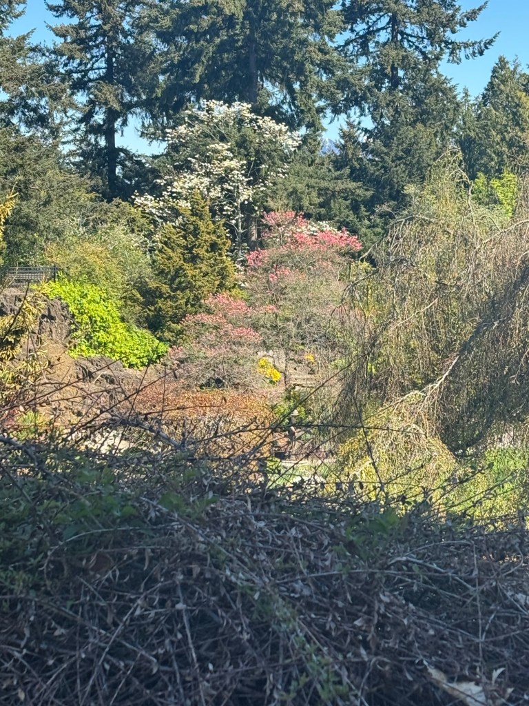 We sat there for around an hour and then we moved on. We walked through another piece of woodland and some meadows. Then we reached the quarry garden. The former quarry on Little Mountain was converted into a garden into the 1960s. This area has multiple levels and consists of a mixture of trees, shrubs, and flowers. It was really beautiful, but we were probably a couple of weeks too early to experience the full effect of this. It only just started to warm up a little just before we arrived.