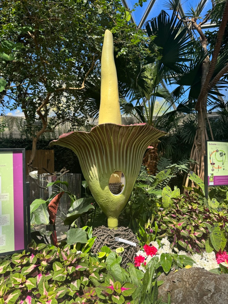 I have to admit that I was interested more in the birds than in the plants. There was one exception to this though. The Bloedel Conservatory is home to a titan arum or corpse flower. This rare flower was named Uncle Fester by the public in a city-wide poll. Corpse flowers only flower rarely, but Uncle Fester flowered for the first time in July 2018, and for a second time in August 2021. It is believed that they only flower a total of three times. Uncle Fester was on display at the Bloedel Conservatory both times while he was in bloom. However, at other times, he normally lives at a greenhouse off site. He was returned to the Bloedel conservatory when he started to grow a leave in 2023, which was the first time he was on display in this stage. He has now gone back to being dormant. This is a definite blessing as corpse flowers emit a stench that is described as a mix if rotten flesh, with notes of old fish and decayed cabbage when they are in bloom. Fortunately, they are entirely stench free when they are dormant or in their leaf phase, but they are still quite beautiful.