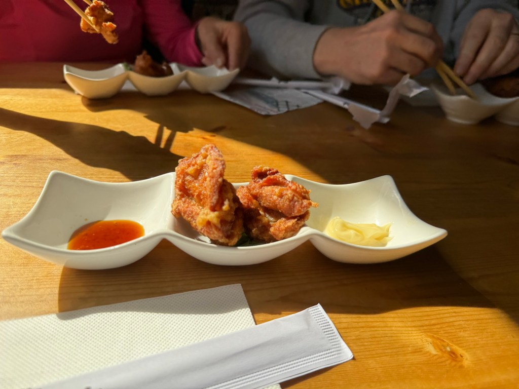 Once we had finished our beers, we headed out again. We just had to walk around he corner for our second stop. Our destination was called Guu with Otokomae. Guu with Otokomae is an izakaya concept, which is essentially the Japanese take on a tapas bar. Izakayas specialise in serving alcoholic drinks with small plates. We were not there to drink, but we had some karage chicken with a hot & sour onion sauce and garlic mayo. Rachel recommended that we dip the chicken in both sauces. I tried this with my first bite, but this did not do anything for me. I did however really like the dish when I just dipped it in one sauce at a time.