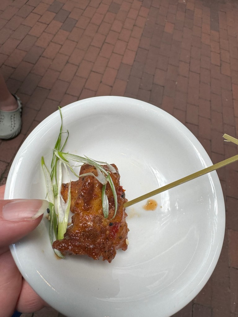 Up to this point, we had sat down at each stop to eat or drink. This time round, we ate while standing outside the venue. Our next stop was MeeT in Gastown, which is a vegan restaurant. We had vegan sweet & chili cauliflower wings. I normally hate cauliflower. I don’t like the taste or the texture. Those however I did enjoy. The marinade covered the cabbage taste, and the texture was crispy on the outside and melt in the mouth tender on the inside. I was struggling to believe that this was actually cauliflower. Graham was not quite as convinced. Rachel pointed out a certain irony. The address of MeeT in Gastown is Blood Alley. This was the old meat district.