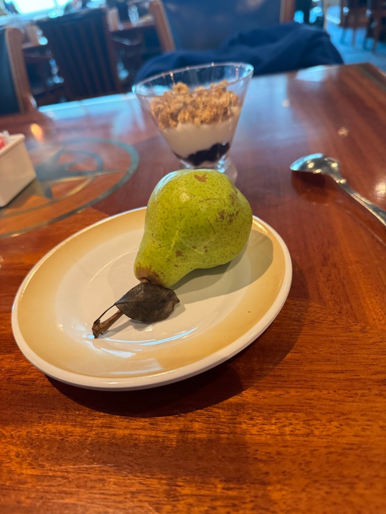 There was another scavenger hunt going on, which is not really our thing. We did just stay and admire the views. Just before 13:00, the string duo came to get ready for their set. As we had no wish to have our ears assaulted, we decided that this was a great opportunity to get some lunch. We headed up to the Windjammer. Graham had some breads and salads followed some butter chicken and rice. I had some hush puppies, a French onion burger, chicken nuggets and fries for my first plate and then had some of the butter chicken and rice on Graham’s recommendation. Everything was very nice. One of the dessert options that day was pistachio pound cake. This was as good as it was on Navigator in November. I also had some chocolate soft serve.