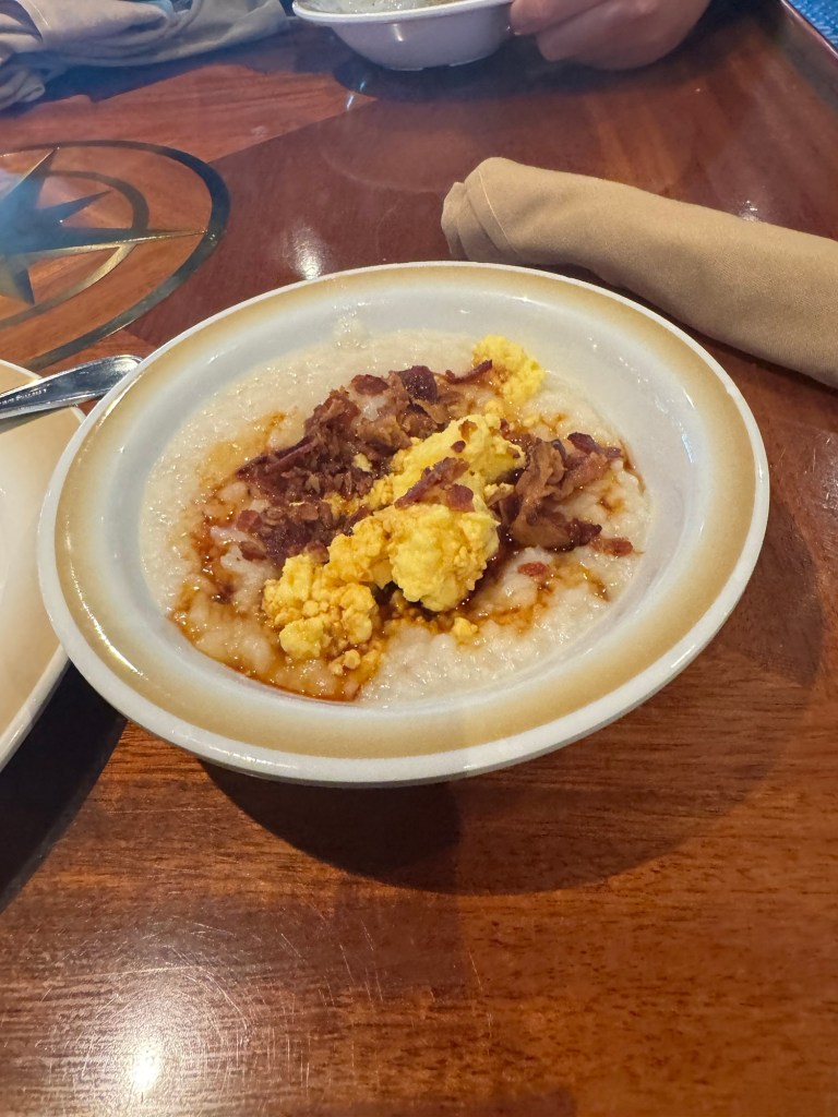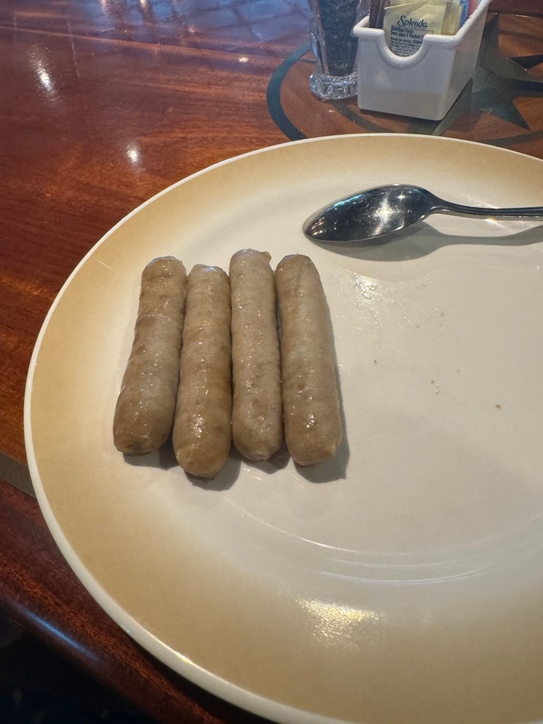 We both started with fruit. Graham had a selection of cut and tinned fruit with different types of bread. I had a pear and some fresh blueberry yoghurt with granola. Graham then had some oatmeal with raisins and brown sugar. I had checked if there was any congee when I got my pear, but could not spot any. I was kind of surprised about this as there was a significant number of people on Chinese origin on this ship. I had planned to get hash browns and sausages for my second plate. Fortunately for me, the hash browns had run out on the side I checked. I decided to check out the other side. There were no hash browns on that side either, but there was a small pot of congee tucked away at the end of that section. There was not much in terms of toppings. There were spring onions, ginger, chilli flakes and bacon crumbs. Normally there are all kinds of meats , chopped egg and vegetables as well as a range of Chinese condiments. I saw that a Chinese lady added some scrambled eggs to her congee. I figured that this would work. There were also some bottles with soy sauce in the area with all the condiments. I made myself a bowl of congee with scrambled eggs, bacon crumbs and soy sauce. It was not the best congee I ever had, but it was tasty and nutritious. I also had some sausages.