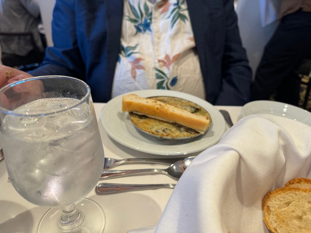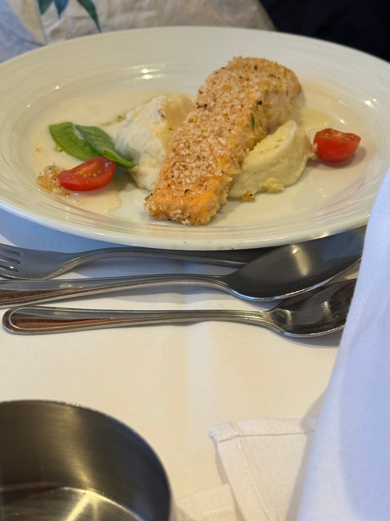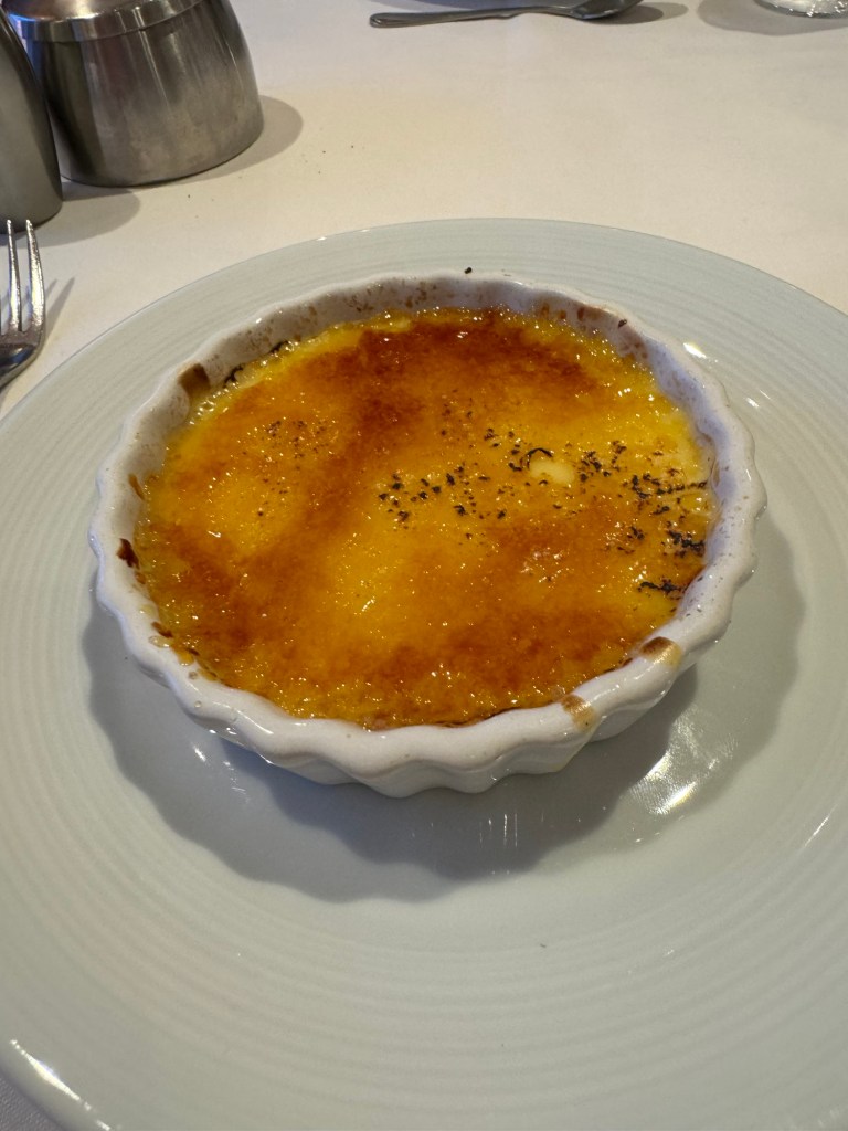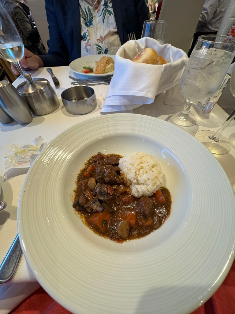 After this trivia, we decided to head back to the cabin for some downtime. I had ever intention to just read, but fortunately I had the foresight to set an alarm as both of us fell asleep. When the alarm went off, we took turns having a shower. We got changed and then headed down to dinner. That evening was dress your best night. Again, when we came down, all the photo opportunities were closed. We went straight for dinner. We were given the same table again. The menu that evening was A Taste of France. Graham started with the escargot, and I had the French onion soup. For his main course, Graham had the fragrant herb crusted salmon with celery root puree, snow peas and a lemon butter sauce. I went for the classic beef Bourguignon with white rice. For dessert, we both had creme brûlée. We had a couple of glasses of Chateau St. Michelle Riesling each. Dinner was very nice.