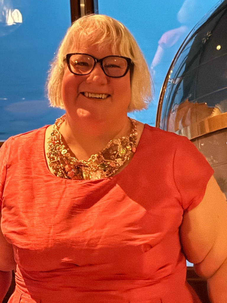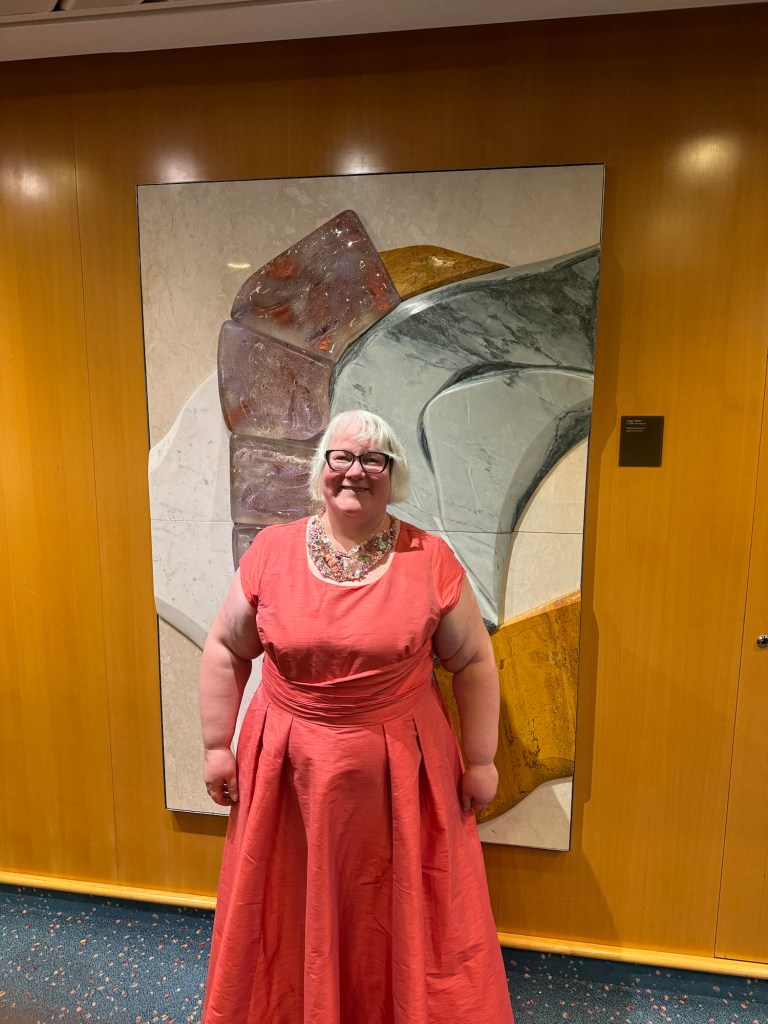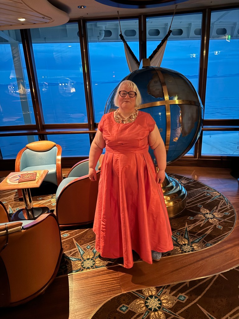 After dinner, Letitia was back taking photos outside the dining room. We stopped to have some photos taken and then we decided to find some artwork so that Graham could take some unofficial photos of my outfit. I had picked the globe in the Schooner Bar, but the photos came out darker than I had hoped. He took a second set near one of the marble and glass panels that were all around the midship landings of the ship and that I really loved. Then we headed back to the cabin to get some sleep.