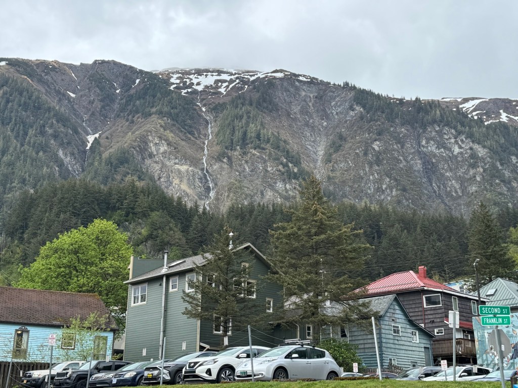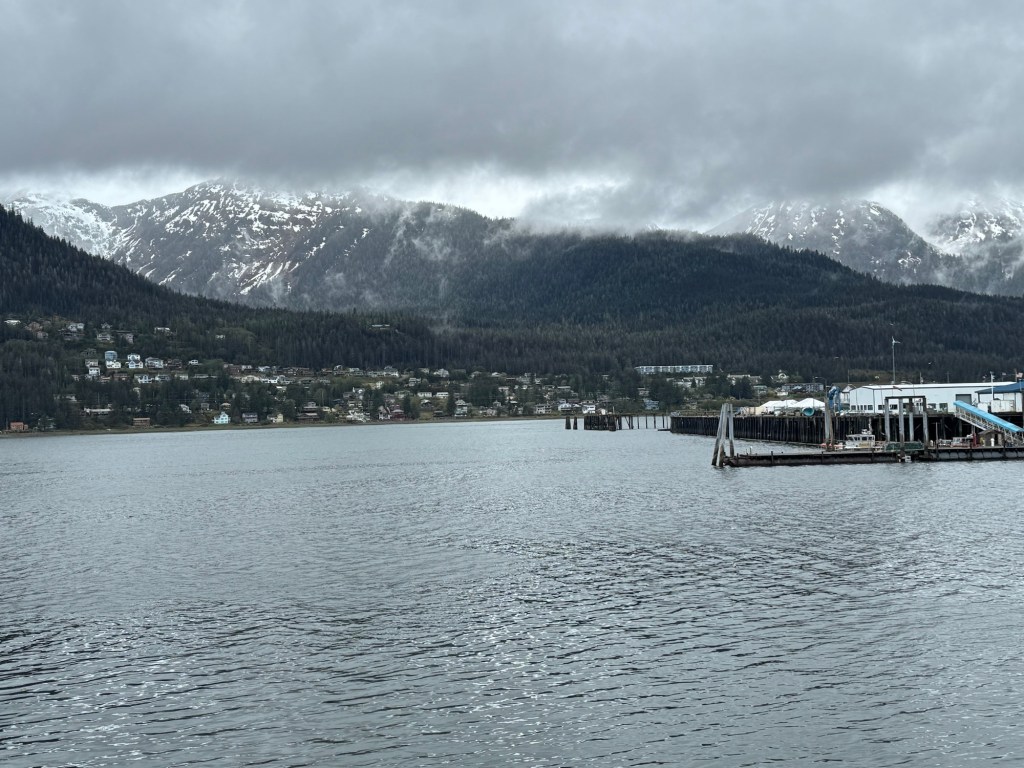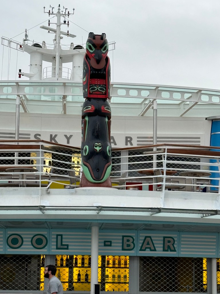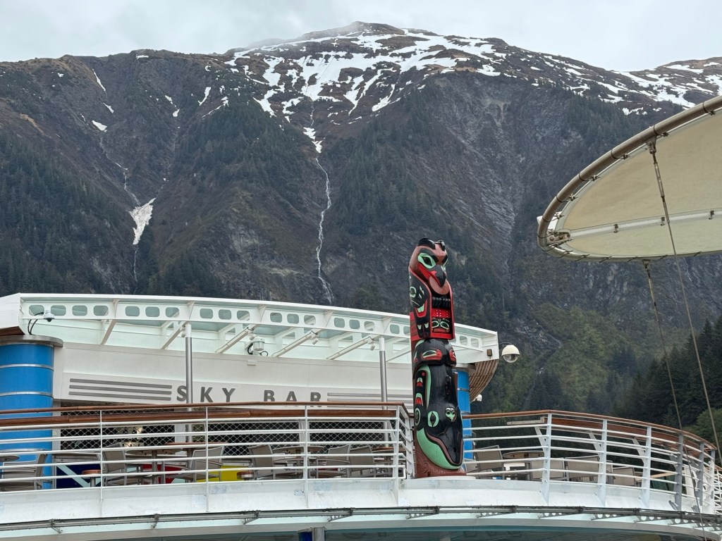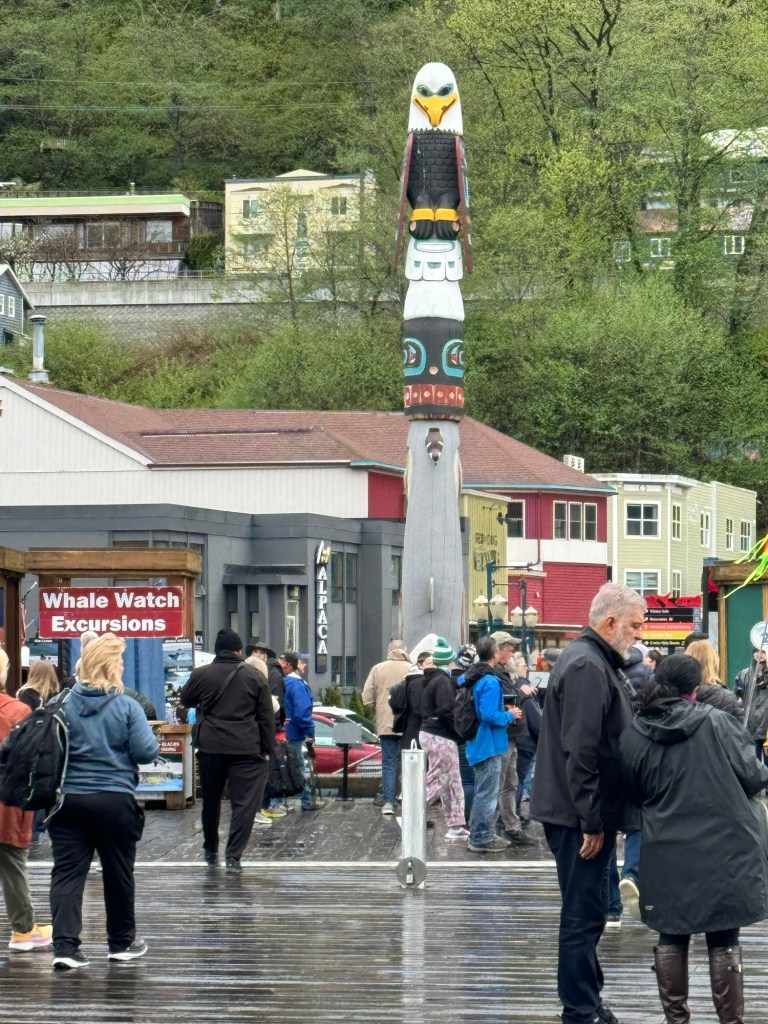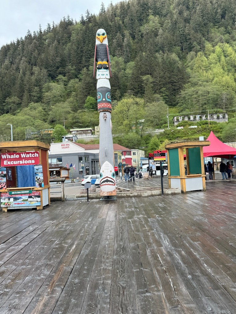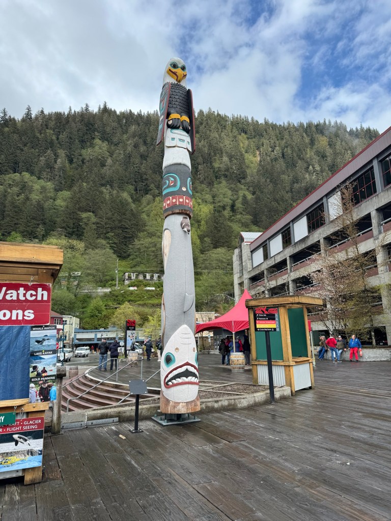 I caught up with Graham not long afterwards. We were the only ship in Juneau that day and therefore were docked downtown. The weather forecast was abysmal. Fortunately, it was not raining when we got there. We did not really have any plans beyond that I was hoping to do some souvenir shopping and Graham wanted to get some cash. As soon as we were off the ship, we came across a beautiful totem pole. I took a photo, but there were a lot of people milling around. We then checked out the tour booth. When we were in Juneau in 2022, there were a few different companies that offered shuttles out to the Mendenhall glacier. The price was about $40 per person, which included the permit to access the national park and the shuttles ran around every half an hour. It was up to you how long you wanted to stay. This year, the price had gone up to $90 and you had to return two hours after leaving from the port. This gives you about 90 minutes at Mendenhall glacier. We had about that much time on an excursion in 2022 and it was nowhere near enough. That is why we had wanted to go back. We gave up on this idea for our repeat visit to Juneau.
