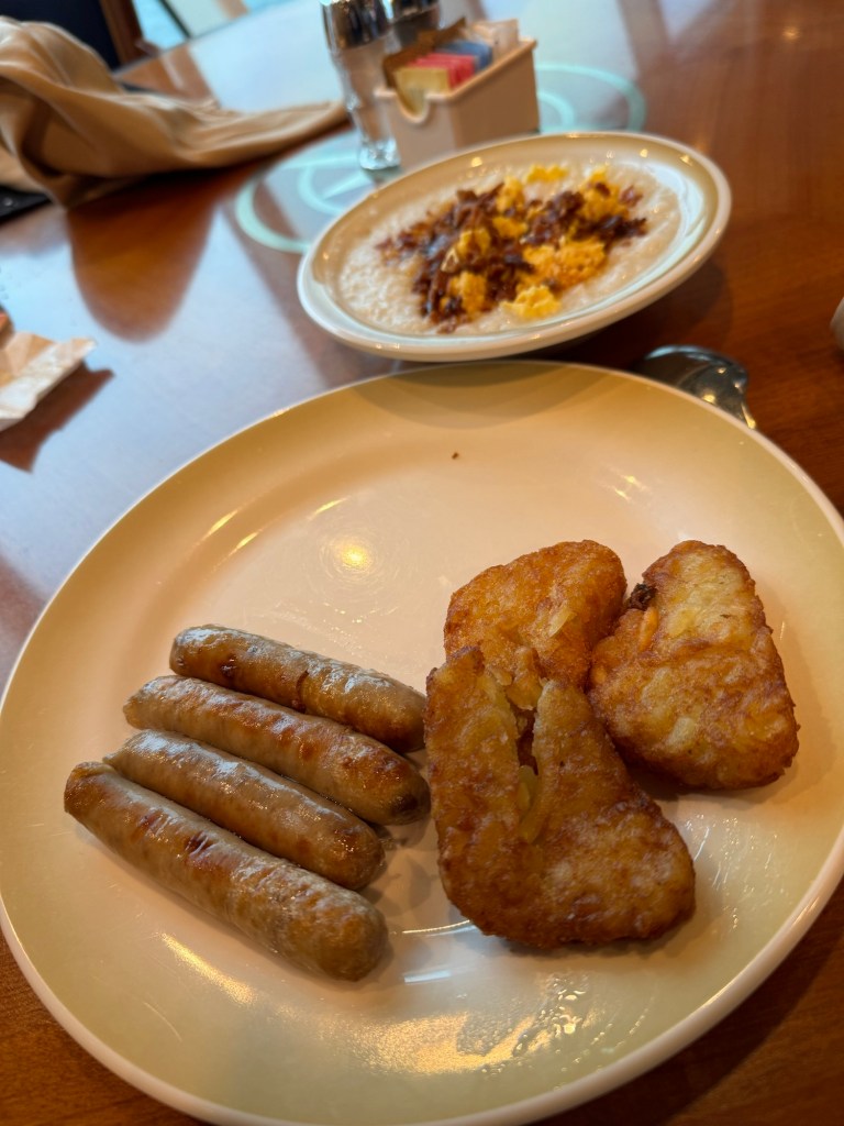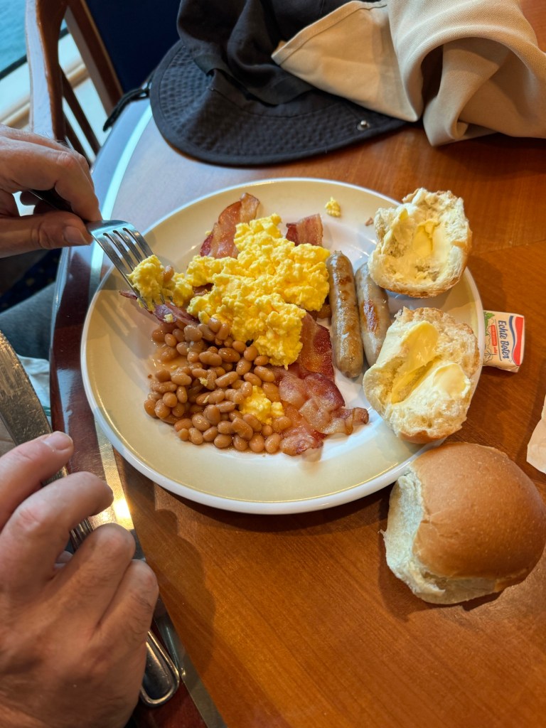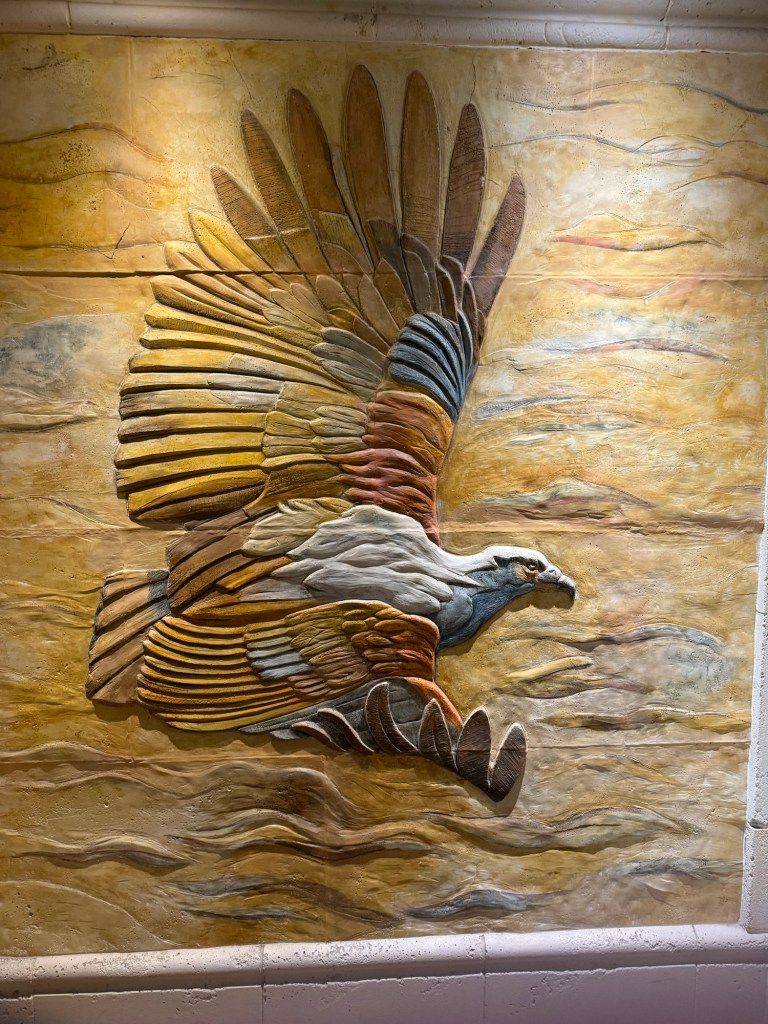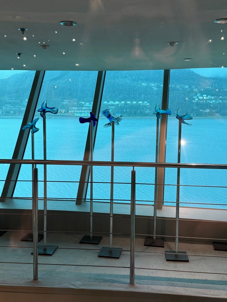 We were awake at 06:30 and got up and ready. As soon as we were ready, we headed up to the Windjammer for some breakfast. It was grey and dreary, but it was dry. I took some photos of the beautiful scenery and I finally got around to take a photo of the totem pole. Then we got some breakfast. Graham had a cooked breakfast consisting of scrambled eggs, baked beans, bacon and sausages with a crusty roll. I had some sausages and hash browns. Normally the hash browns on Royal Caribbean are great, but they had a cardboard quality. I did not bother again. I did however enjoy my bowl of congee. It was again quite busy. As soon as we finished our food, we left. I took some more photos of the scenery as well as the artwork outside the spa. I particularly liked a terracotta panel of an eagle in flight.