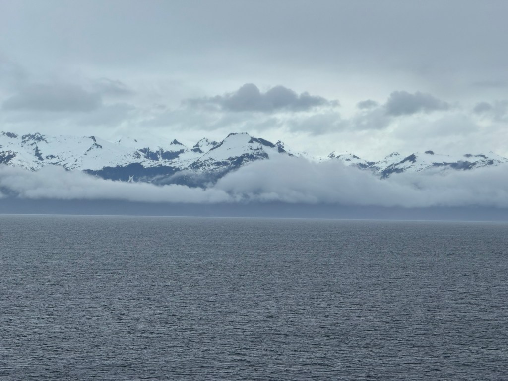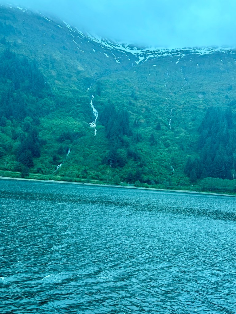 By the time the last trivia was finished, the scenery had become really pretty. We saw plenty of mountains and some of them had waterfalls. I tried to take some photos and it turned out that the windows in the Schooner Bar had a blue tint. This was not visible to the naked eye, but the phone picked up on this. As a result, I have a lot of blue photos. I did try to play around with various editing options, but nothing really worked for me, and blue is a pretty colour.