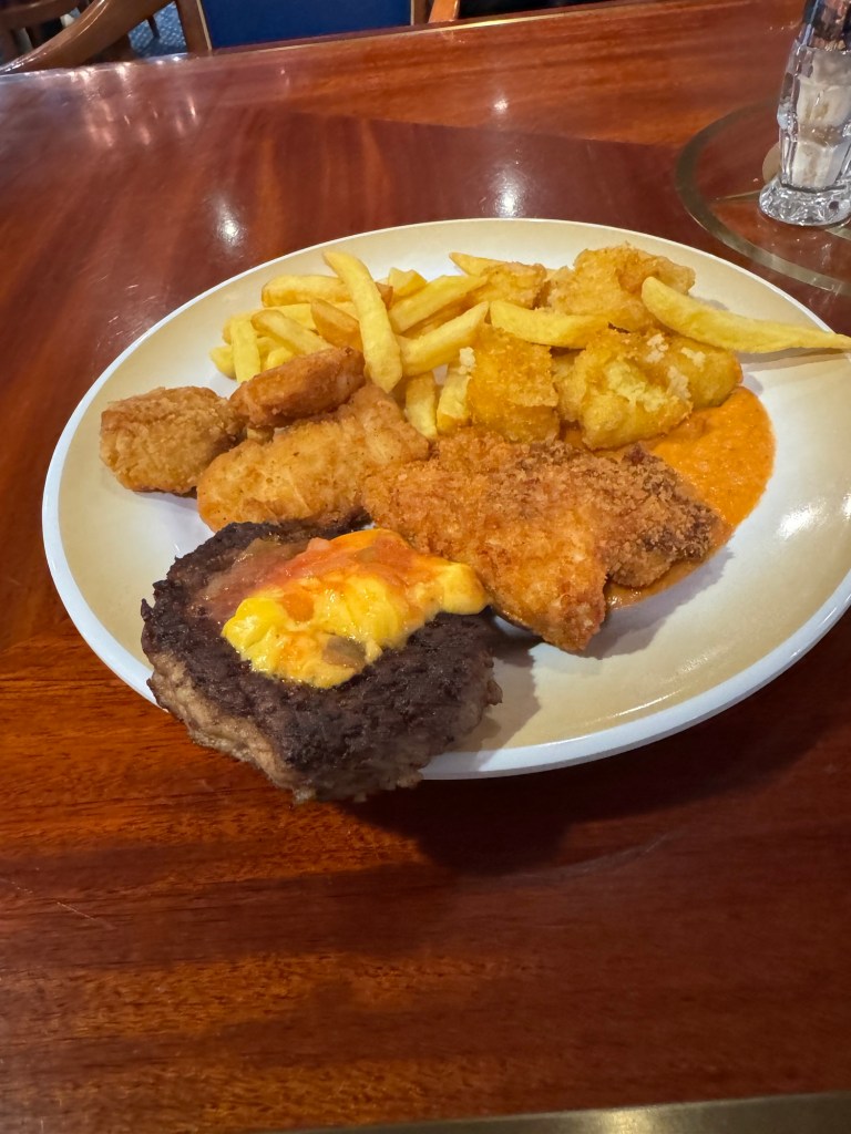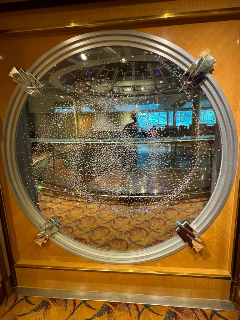 After afternoon trivia, the string duo was doing another set. We fancied another drink, but we did not fancy this. We decided to check out how busy the Crown Lounge was. The answer was not busy at all. They were doing steady business, but we had no issue finding a table. Graham had a glass of Sauvignon Blanc, and I had a Passion Spritz. They also had happy hour snacks out and I had some sweetcorn fritters, chicken bites and some chocolate covered strawberries. Once we had finished our drinks, we moved on.