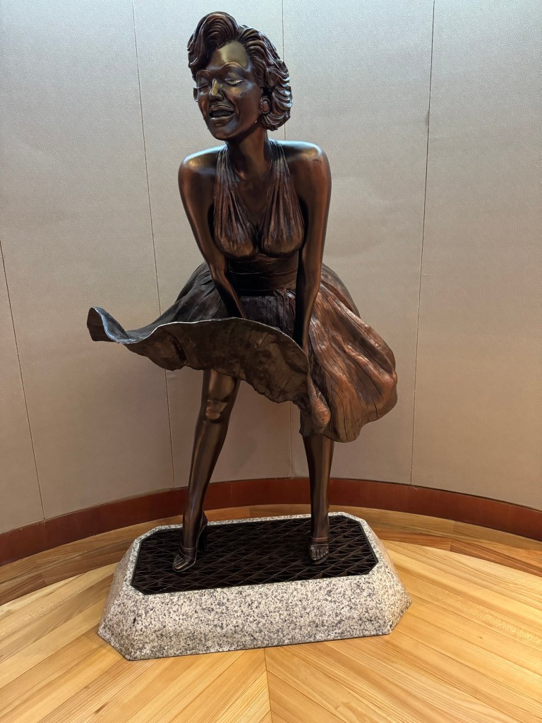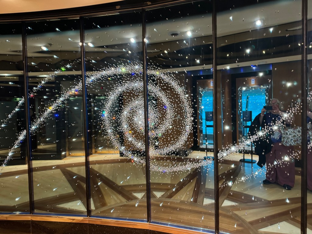 One further reason we had come up there was to check out the artwork. Royal Caribbean prides itself on the art collection on its ship and we normally spend some time admiring this. Not everything is to our taste, but it definitely is eclectic. Radiance is meant to have the best art collection in the fleet that was created in conjunction with London Contemporary Art and is worth around $6 million. The art collection on Radiance of the Seas includes paintings, sculptures, and other pieces by more than 100 different artists from countries around the world, including England, the United States, Norway, France, Italy and South Africa. It is definitely diverse, and I am sure just about everybody can find something that speaks to them. In a way, I felt that the artwork on deck 13 was the best of the bunch. There was a huge mural, a statue of Marilyn Monroe and windows with inlaid Swarovski crystal designs. It really was breathtaking.