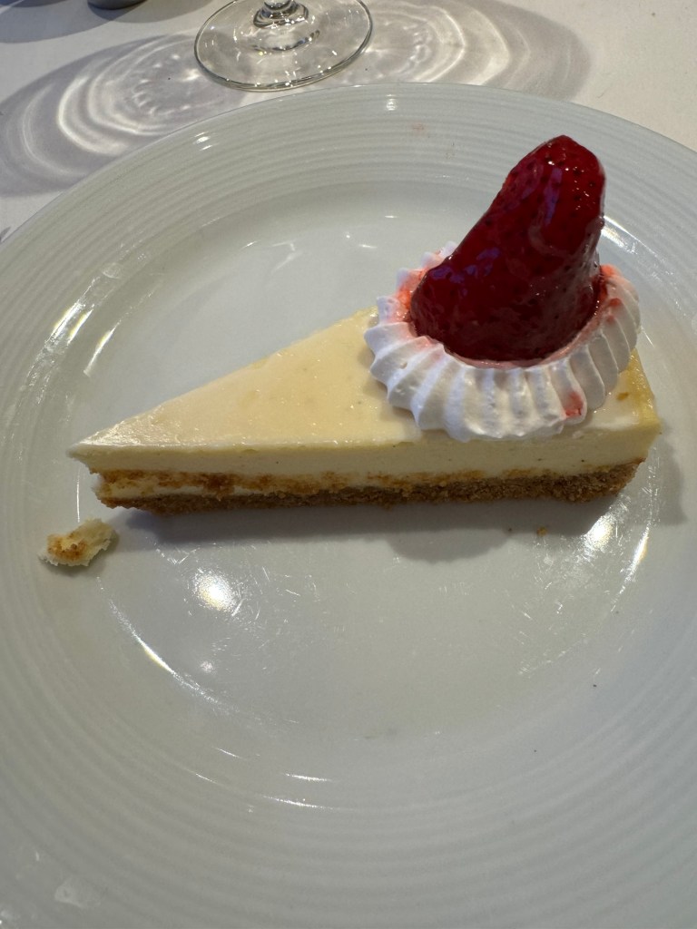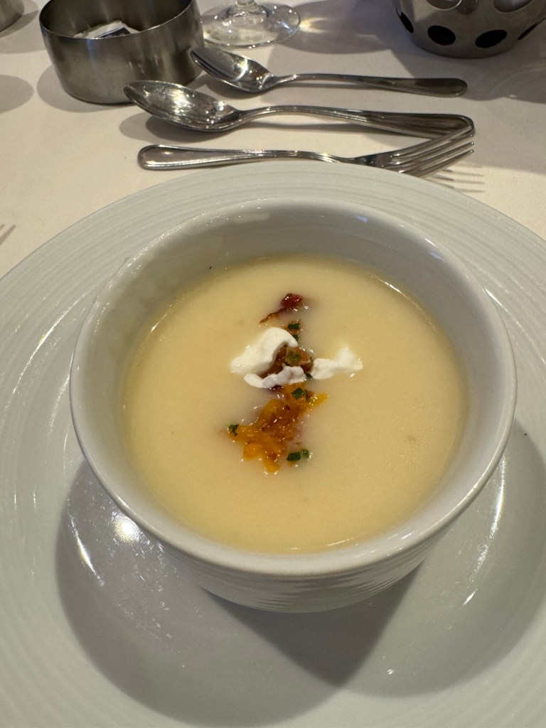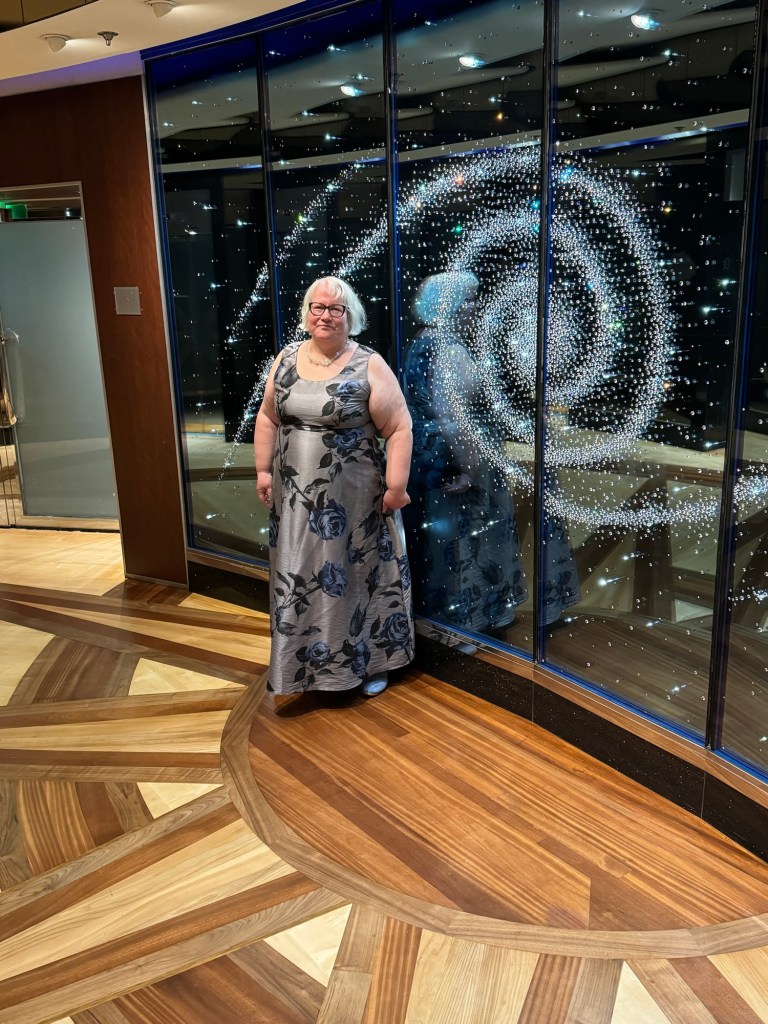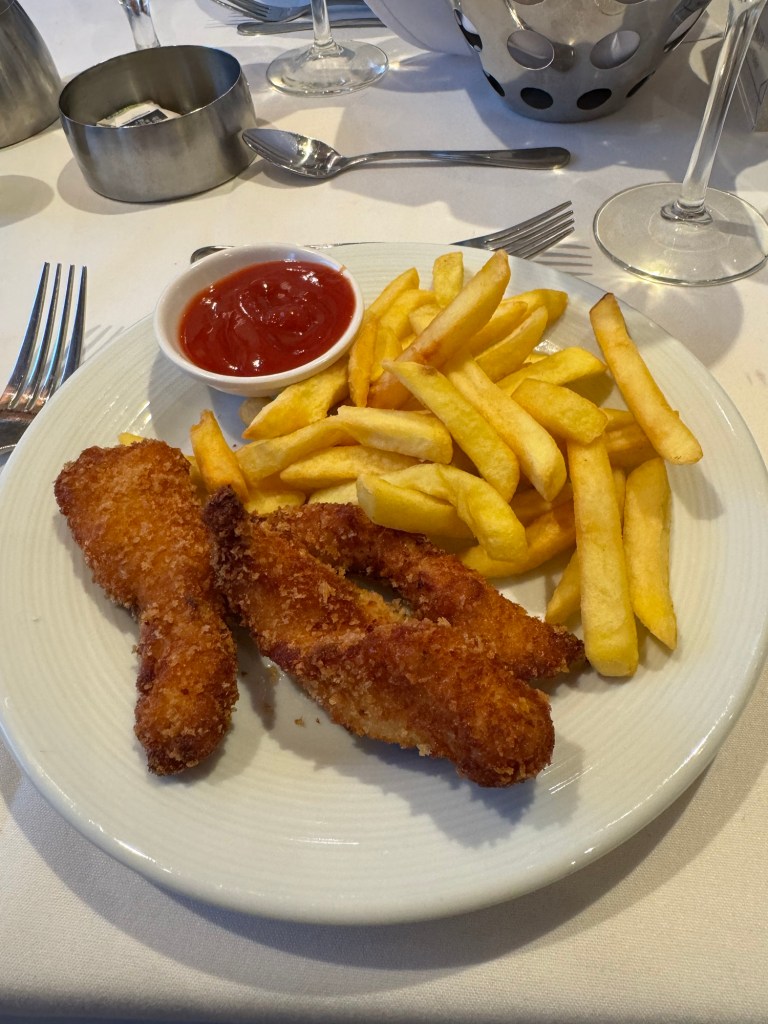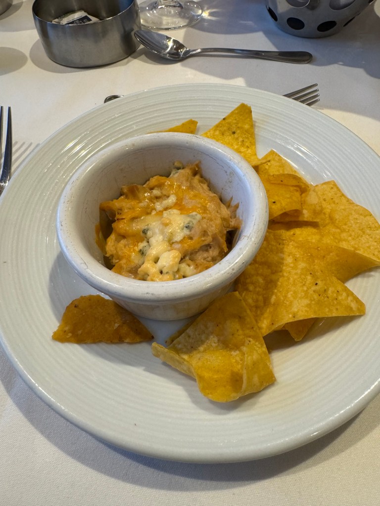 We headed back to the cabin and got showered and changed. Then we went to the dining room. On the way we stopped for some photos. Then we went for dinner. The menu that evening was A Taste of the USA. We had first encountered this on Navigator in November, and I really enjoyed this. We both started with the baked potato soup with Cheddar cheese, crispy crumpled bacon, sour cream and chives. I also had the Buffalo chicken dip with crispy corn tortillas. I had really loved this on Navigator, but on Radiance, this was just OK. For his main course, Graham had Bourbon-glazed salmon with buttermilk mashed potato, crispy roasted Brussels sprouts and Dijon honey. I picked my main from the children’s menu that night and had chicken tenders with chips. Graham had some Royal cheesecake for dessert, but I passed.