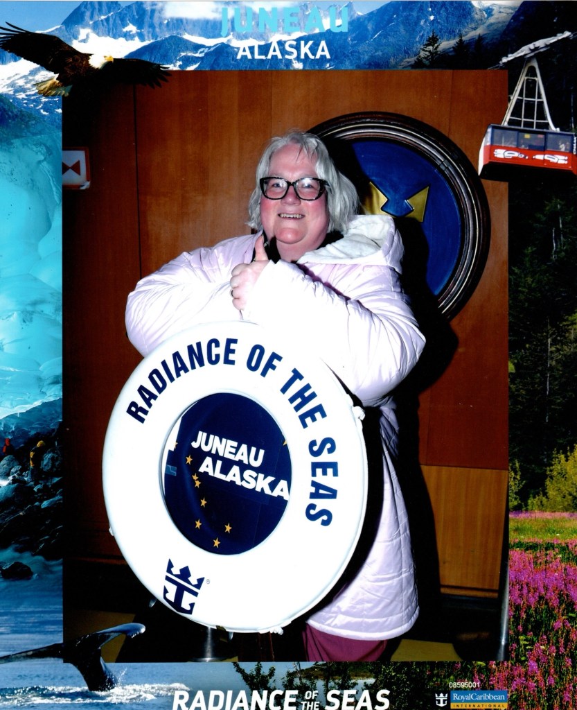 By the time we had finished lunch, we had arrived in Juneau. I took another photo of the totem pole with a mountain in the background. Then we went back to the cabin to get the stuff we needed to go ashore. As soon as we got to the cabin, there was an announcement that the ship had been cleared. We headed down to deck 2 to head out. Things were a little chaotic that day. There were people coming from all directions. The reason I got the basic photo package was that I wanted the frames for each of the ports. In Alaska, the photographers are not allowed to take photos outside the ship, which meant that they had set up on deck two. To give them credit, this ended up being the first Alaska cruise of the season and they had not yet worked out how to best handle this. There was one photographer with a certain deer in the headlights look in the middle of the worst crowd. Graham took one look at this and headed for the gangway. I stayed slightly back and managed to get my photo. By the following day, they had sorted this out.