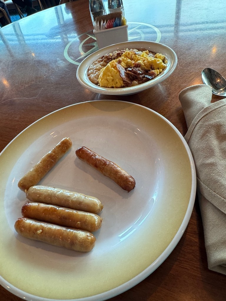 We had our standard breakfast. Graham had fruit followed by oatmeal with raisins and brown sugar and I had a bowl of congee with a side of pork link sausages. Graham had an orange juice, and I had an apple juice. We both had a cup of coffee.