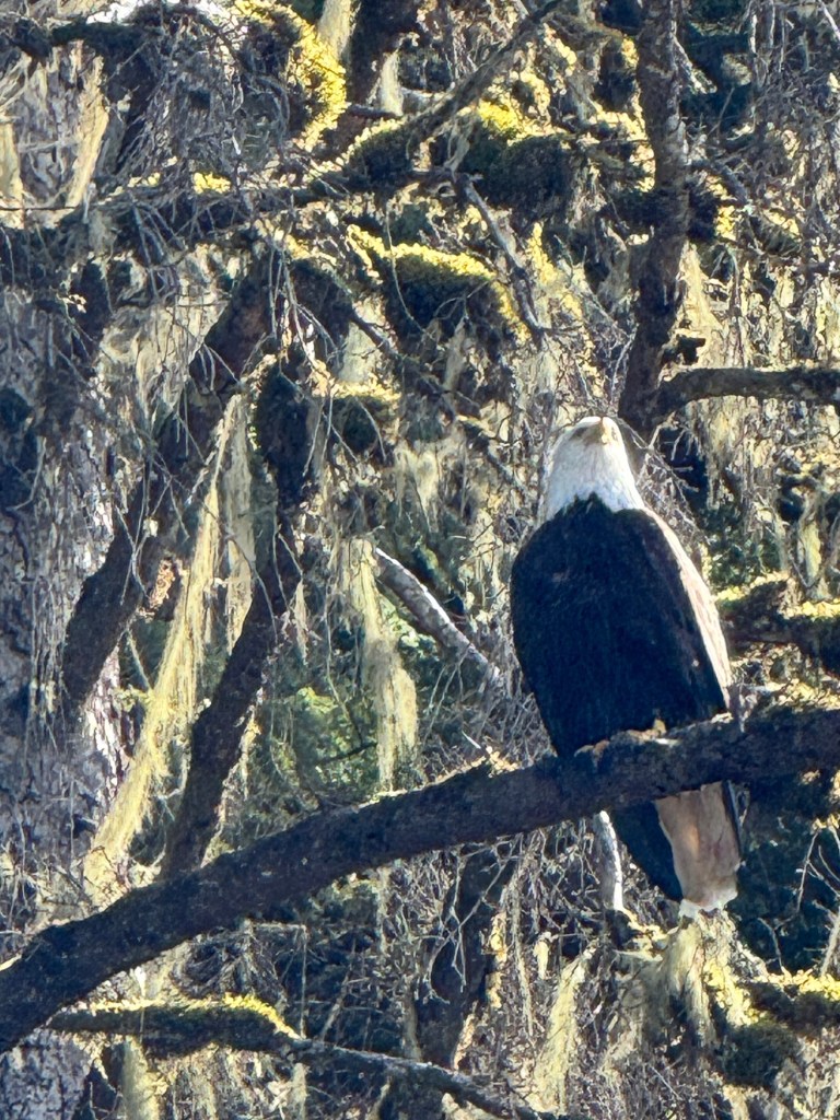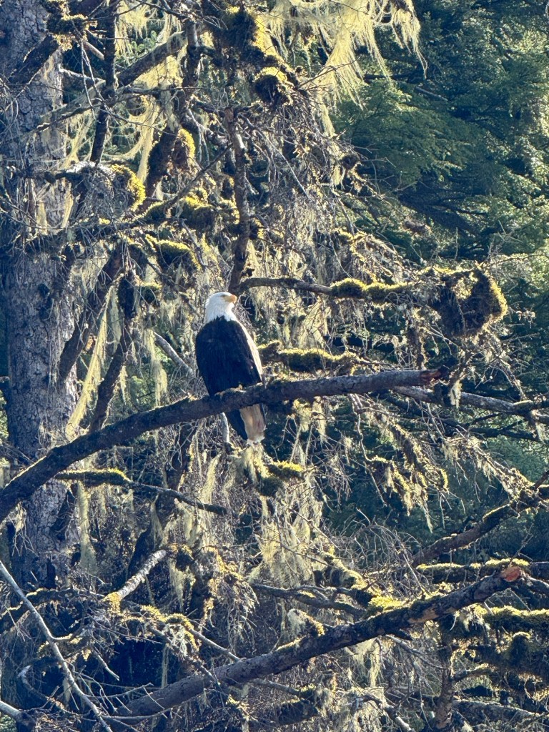 Speaking of privilege, even though this was really cool, the best was still to come. We had sat down on a bench on a stretch of beach for a while as there were some interesting birds about. We were just about to move on when a bald eagle decided to do some fishing. He or she did not catch anything, but when the bald eagle came back, he or she flew quite low right over our heads. I was so spellbound by this; I did not even think about getting my camera out. Fortunately, the bald eagle did not go very far, and we got some photos of the bald eagle up a tree.
