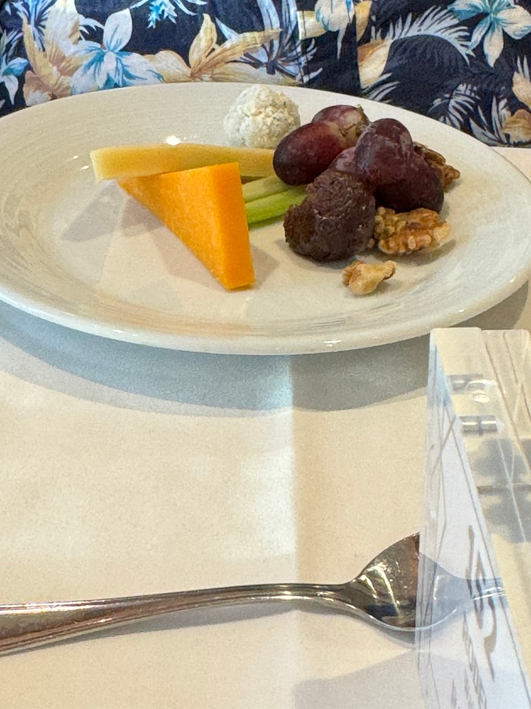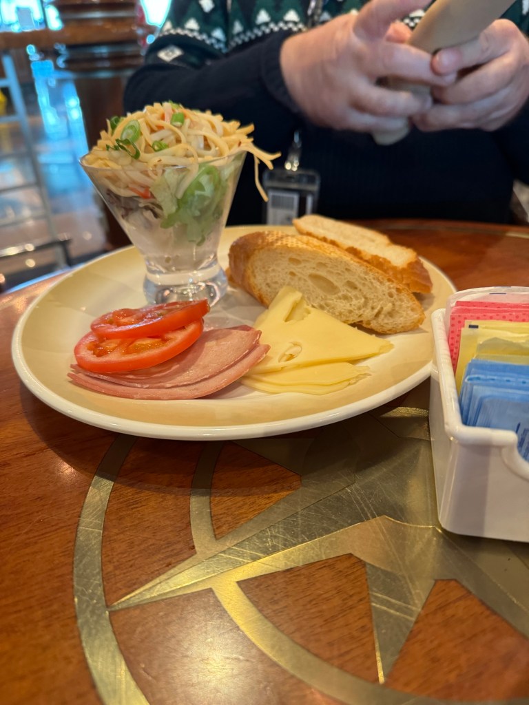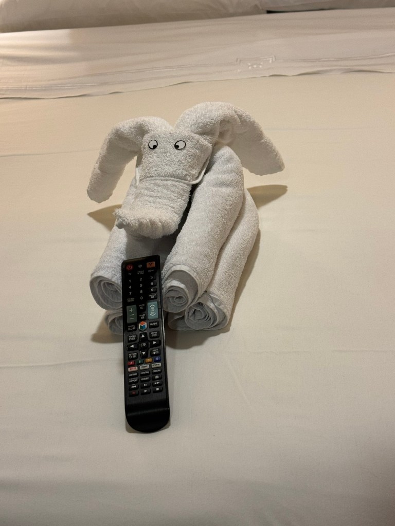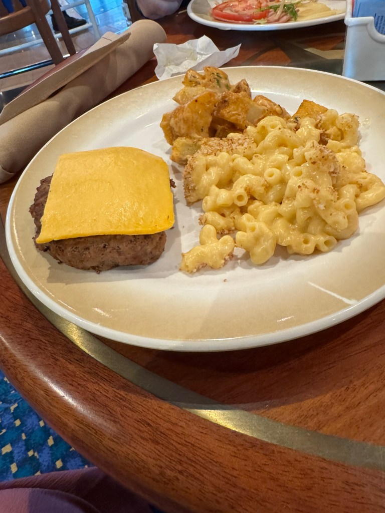 We dropped our stuff in the cabin. We had a new towel animal. I took a quick photo and then we headed up to the Windjammer for some food. Graham had some Asian noodle salad, tomato, cheese, cold cuts and breads. I had a cheeseburger, macaroni cheese and some cheesy potatoes. I had a mini trifle, a chocolate pot and some walnut pound cake for dessert. Graham passed.