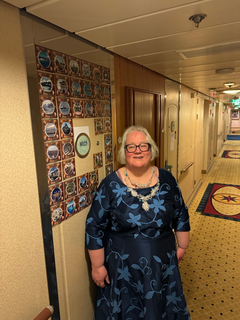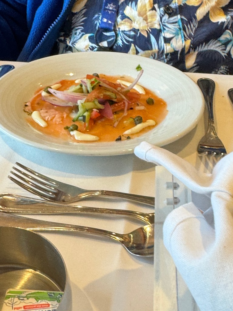 After the trivia, we went back to the Schooner Bar. We enjoyed some more whale watching. Graham had another Irish Coffee, and I had another dessert pear margarita. The live music that day was a very talented pianist. We stayed for her first set and most of the second before quickly going back to the cabin to get showered and changed. We stopped for some photos on the way for dinner.