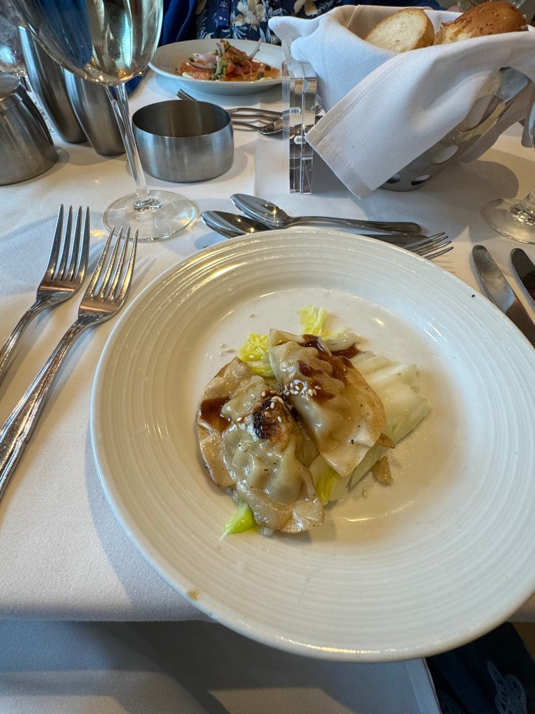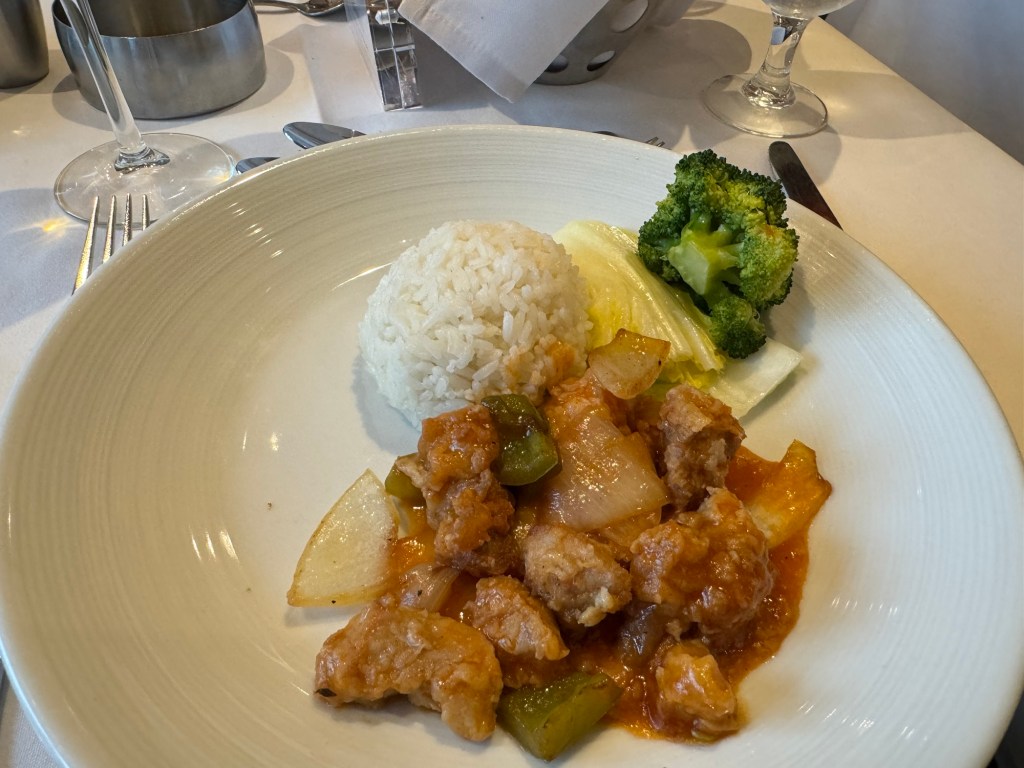 The menu that evening was A Taste of Asia. This was a new menu for us and one I was quite excited about. Graham had the salmon gravlax with thinly sliced cucumber, onion and tomatoes, lemon, capers and a honey-mustard dressing for his starter. I had the pan-seared dumplings with bok choi and a sesame soy sauce. For his main course, Graham had the salmon teriyaki with steamed jasmine rice, sautéed bok choy and snow peas. I had the sweet and sour pork with jasmine rice. This was not anything to write home about. Still, I have been spoiled by the authentic version in Hong Kong and China. For his dessert, Graham had the artisan cheese plate with celery, figs and walnuts. I had the vegan lychee tart with lychees and raspberries and a vanilla-basil drizzle. It was not that the menu was not nice, but it did not quite live up to my expectations. It did pair well with the Chateau St. Michelle Riesling.