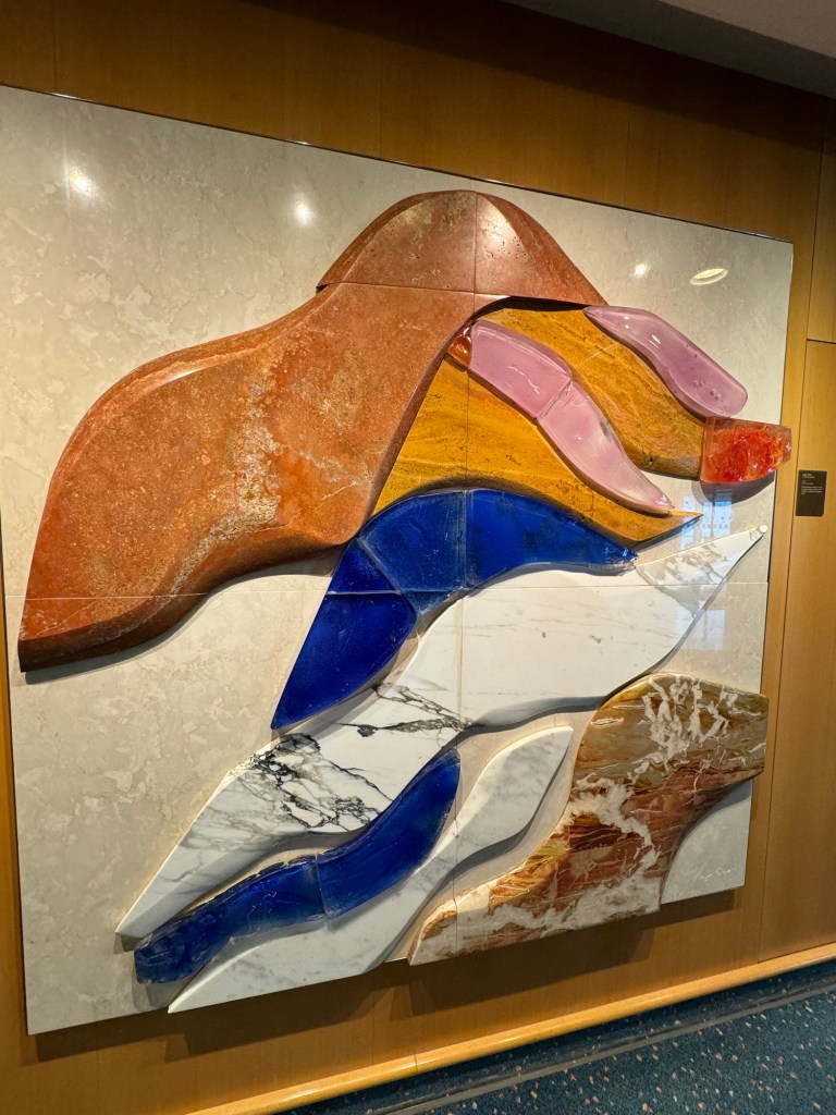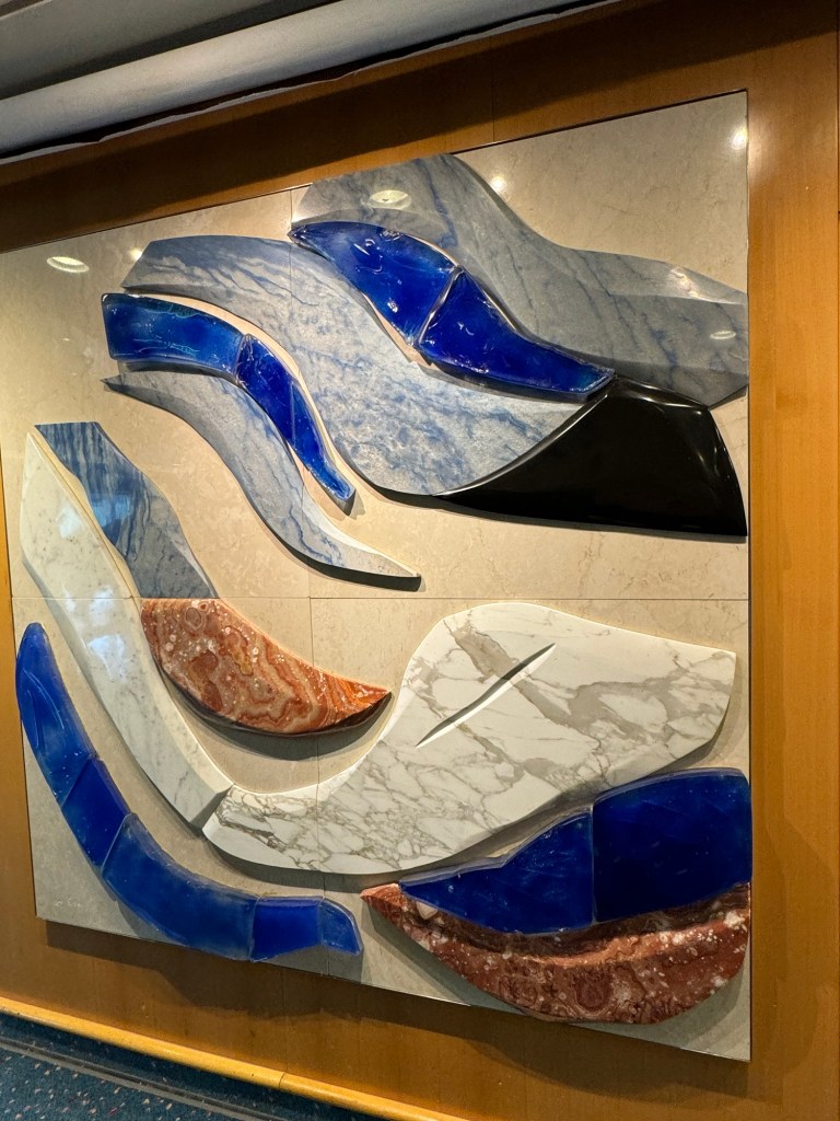 Morning trivia was pretty tough that day. We scored 9 out of 15 and the winning score was 11. After morning trivia, the Schooner Bar emptied out quite considerably. We relocated to a table by the window.  I had not done a great deal of reading since we got on the ship. I decided to head up to the cabin to get my iPad. The rain had eased up quite a bit. I still was not tempted to head out. However, the town was now clearly visible, and I managed to get a photo from the window by the panoramic lifts. I also took a couple of photos of the glass and marble panels on that landing. When I got back to the Schooner Bar, I settled down to read.