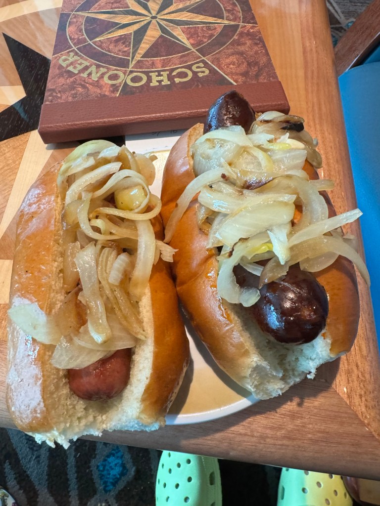 When it was lunchtime, Graham asked if I fancied some hot dogs. I was up for this. On most of their ships they have an outlet serving a variety of hotdogs. When we first started cruising on Royal Caribbean, I was crazy about the hotdogs, but I had not had any for quite a few cruises. I think the last time I had one was before cruising shut down for the pandemic. I liked the sound of this. He headed up to the pool deck and came back with two hotdogs each. One was a classic hotdog and the other was chorizo. Both came with caramelised onions. I preferred the classic hot dog, but both of them were nice.