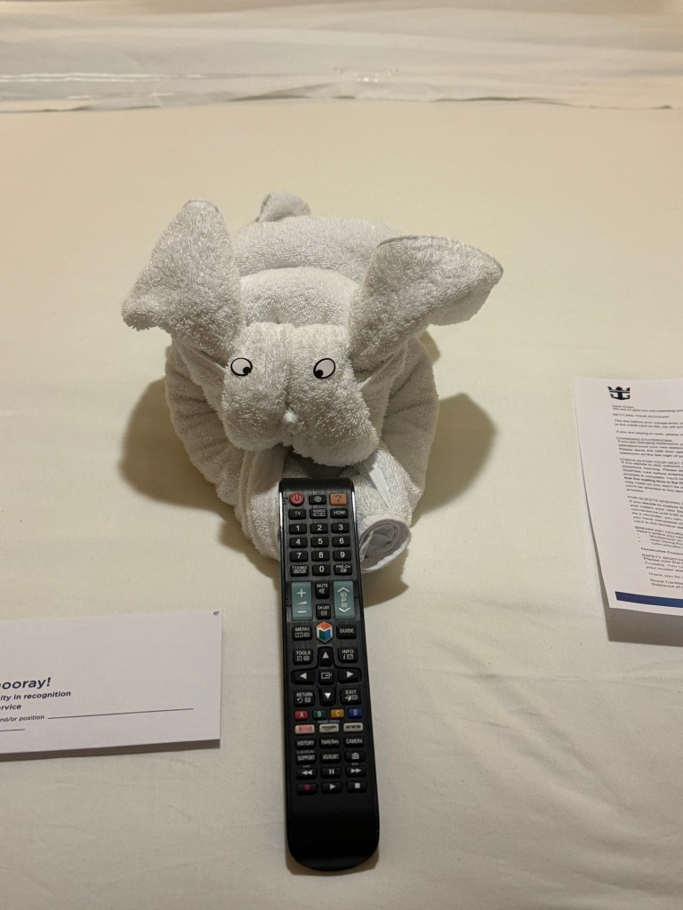 After afternoon trivia, we moved on. The string duo was about to do a set, and we were not about to hang around for this. We headed up to the Crown Lounge for a bit. I had a Passion Spritz and Graham had a glass of Chardonnay. Once we had finished our drinks, we headed back to the cabin for some downtime. We had a towel animal waiting for us.