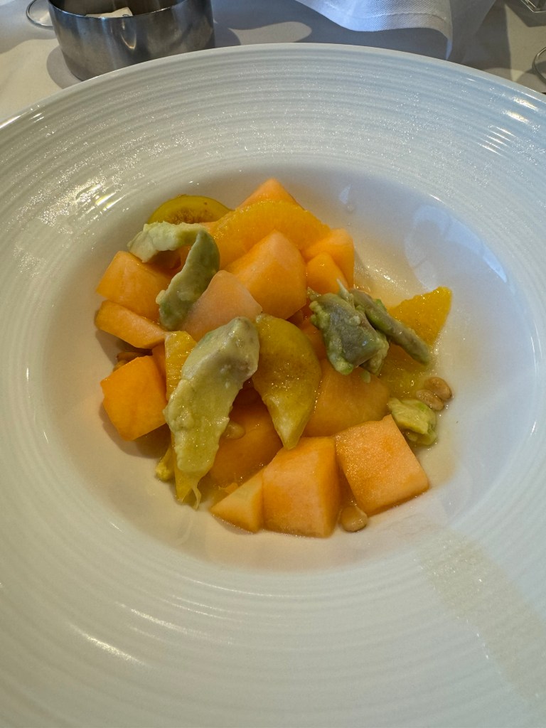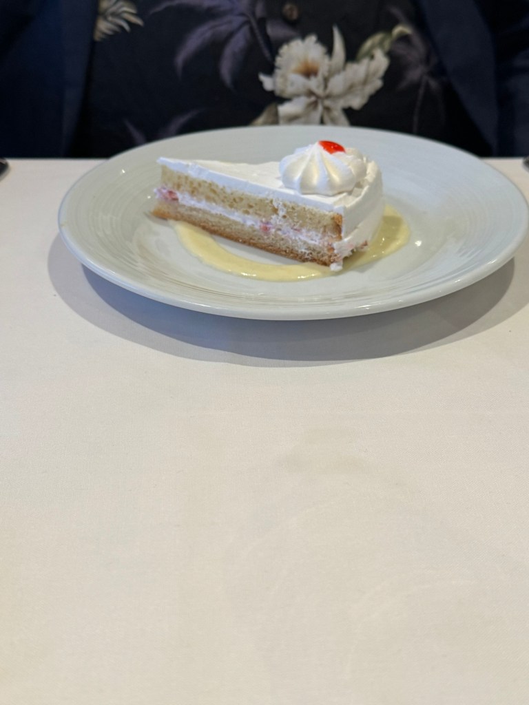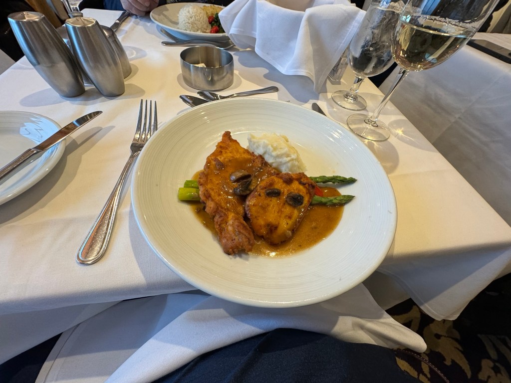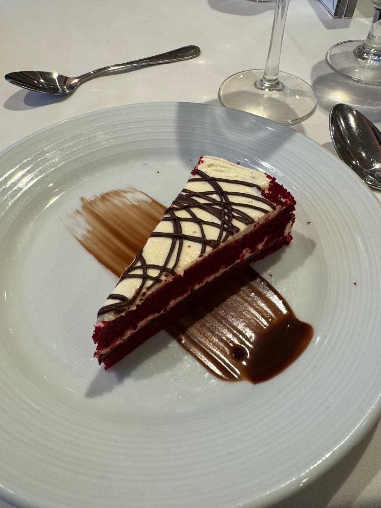 Dinner that night was Royal Night, which is better known as lobster night. However, we both passed on this pleasure. For our starter we both had the vegan bright citrus and avocado salad. This consisted of cantaloupe melon, avocado, orange segments, and figs in maple-lime dressing. This was topped with toasted pine nuts. I had this on Symphony last year and really liked it. Graham also enjoyed this. For his main course, Graham went with the lemon-butter baked cod with  sautéed spinach, citrus rice and a lemon-butter sauce. I had the Chicken Marsala with garlicky mashed potatoes, sautéed asparagus and tomatoes. For dessert, Graham had strawberry shortcake, and I had the red velvet cake. We had a couple of glasses of Chateau St. Michelle Riesling with our dinner.