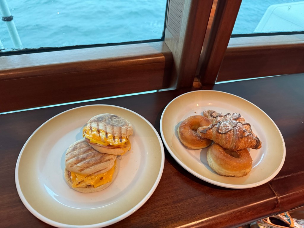 We decided to stake out a spot in the Schooner Bar. I left Graham at a table near the windows and then I headed upstairs to get some breakfast from the Park Cafe. I got us a ham, egg and cheese muffin each plus a donut and a dulce de leche croissant. Once we had finished our breakfast, I headed downstairs to get an Americano for Graham and a caramel macchiato for me. It was surprisingly quiet that day.