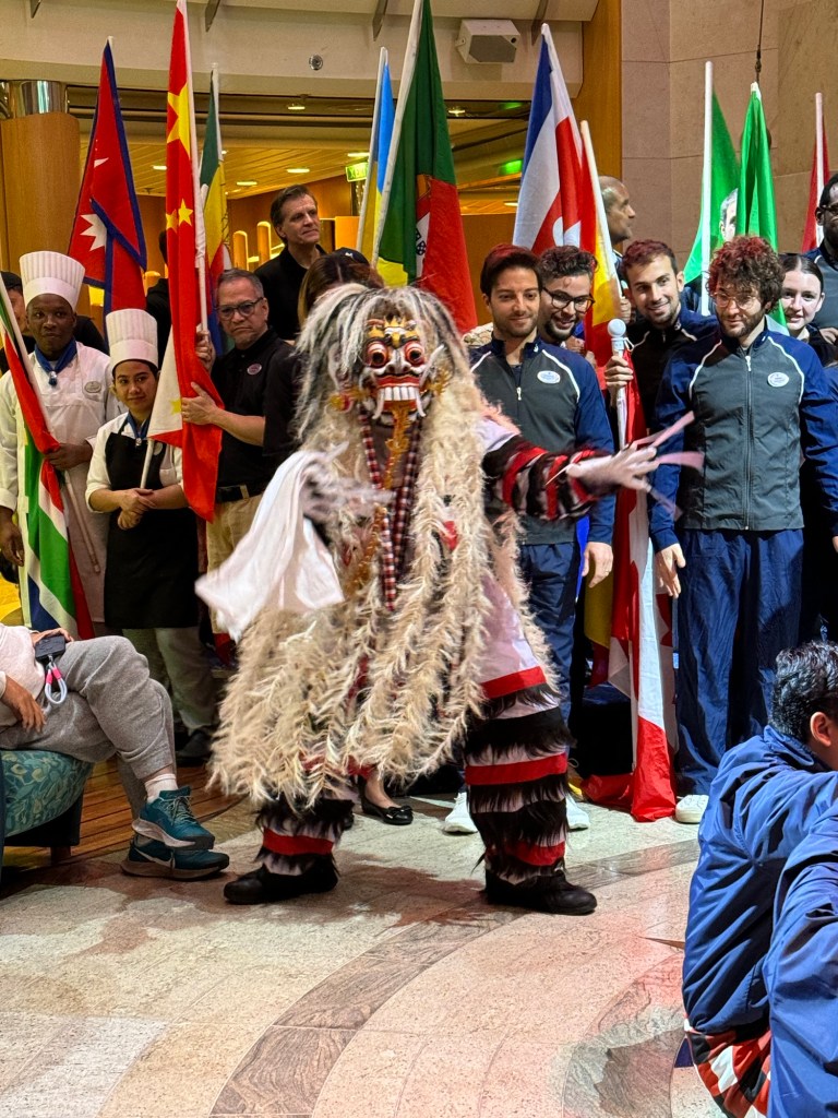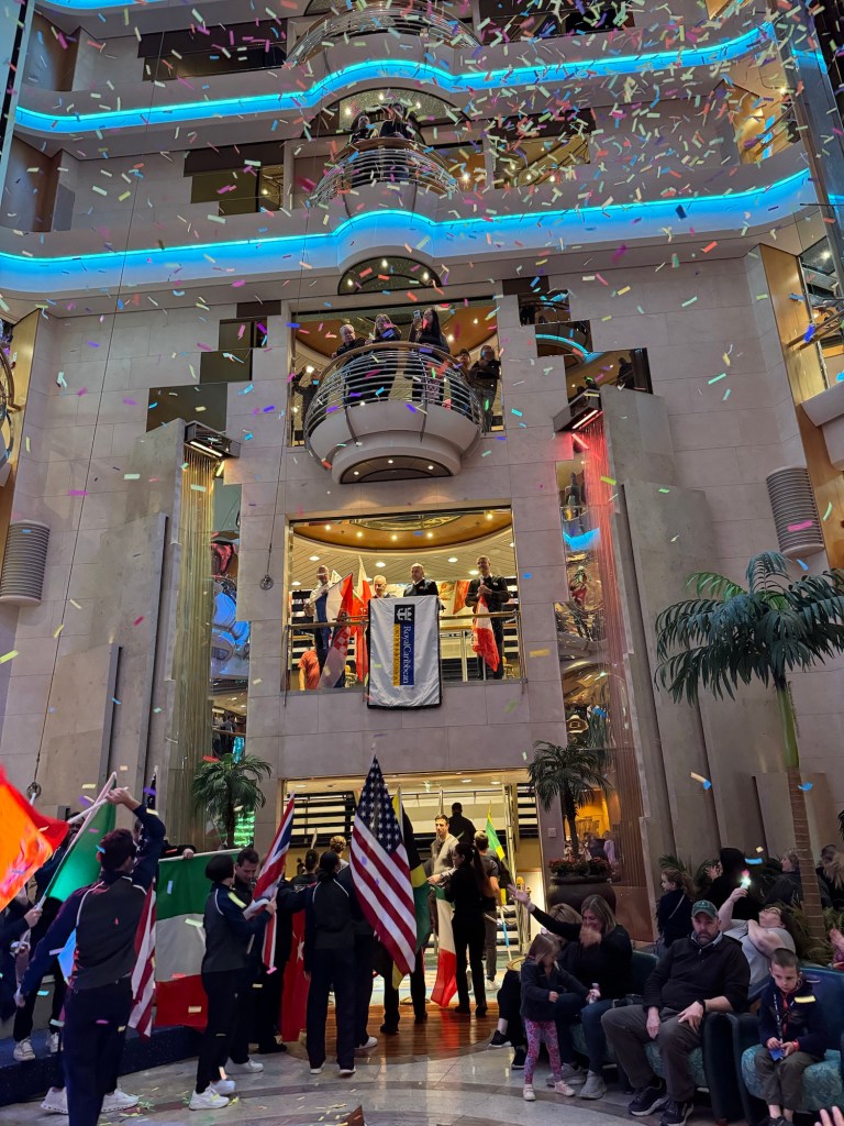 Although it was in general slim pickings for activities that took my fancy, there was some that called me. There was a flag parade in the Centrum. Back in our Disney Cruise Line days, I always found the flag parade in the dining room on the last night of the cruise very moving. In the early days of cruising with Royal Caribbean, they had this as well. I am not entirely sure when this stopped, but I have found the recent incarnation of the “show” in the dining room with something like the Macarena or the chicken dance nothing short of irritating. However, I could not resist the temptation of a flag parade. I think doing it during the day in a public venue makes much more sense. With My Time Dining becoming increasingly popular, coordinating something like a flag parade in the dining room very difficult. This was a really nice event. At the beginning of the flag parade, the flag bearers came down the stairs into the Centrum. Once everybody was assembled, the cruise director called out each nation in turn, mentioning how many crew members came from this country and what departments they work in. I am sure the department for each crew member was not mentioned, but it gave a nice overview. I think Radiance had the most diverse crew of all the ships I sailed on. The countries with the largest representation did some kind of dance representing their culture. It was a beautiful, dignified event. I also thought it was a nice touch that they did not shy away from being slightly political. When the crew members from Ukraine came forward, the cruise director made an announcement that Royal Caribbean and the Radiance of the Seas family stands with Ukraine. It was a simple and heartfelt statement.