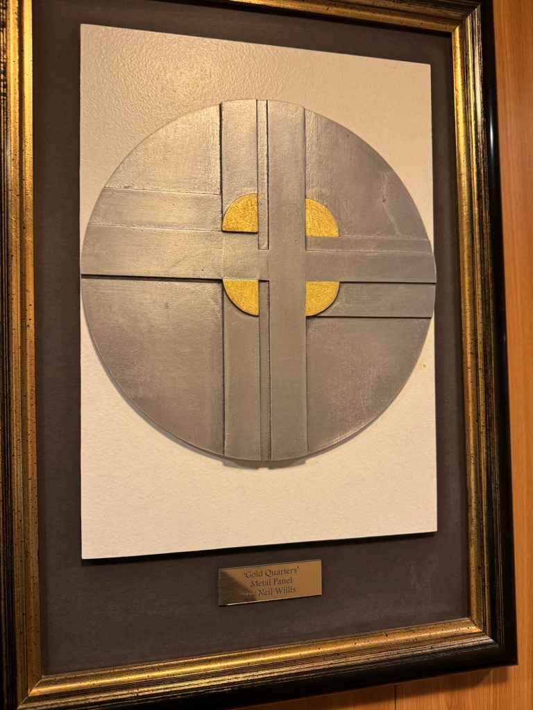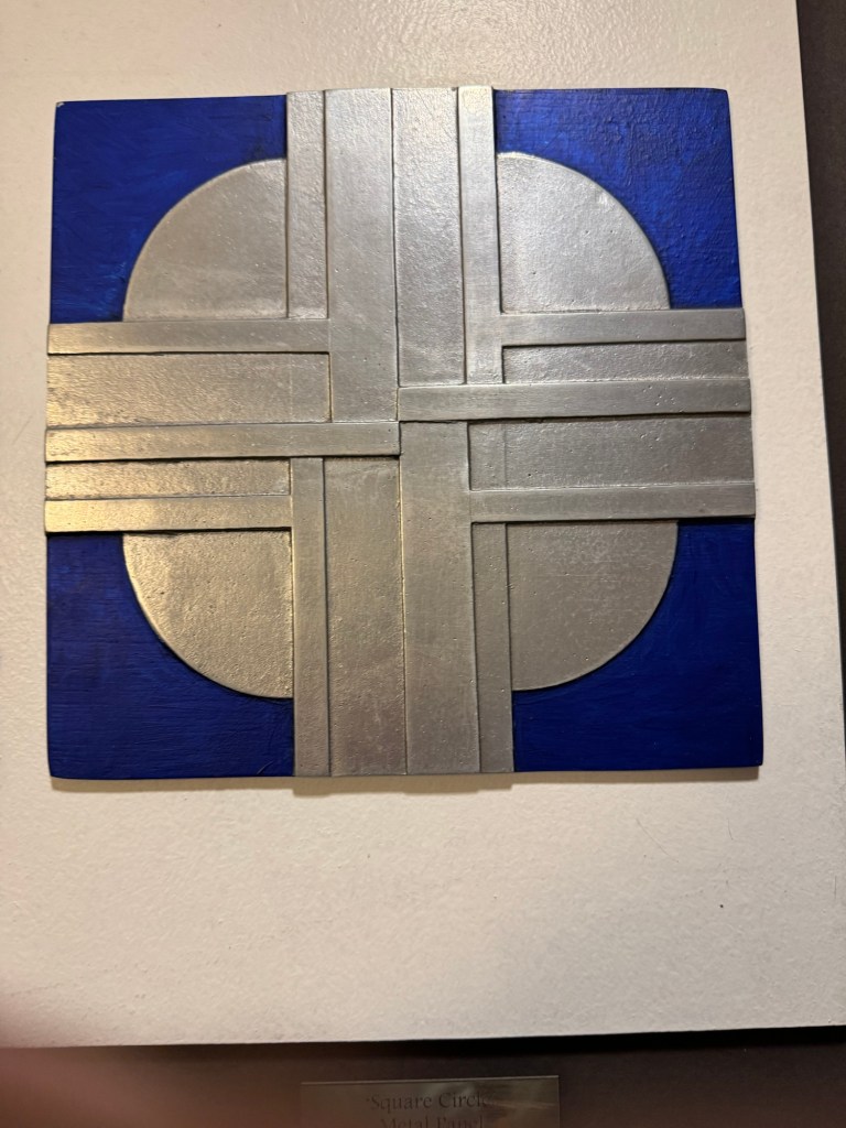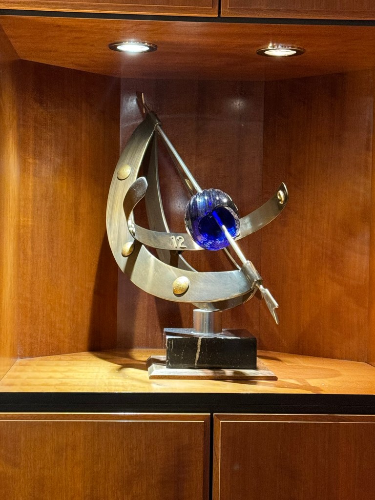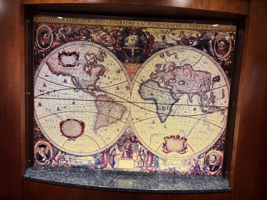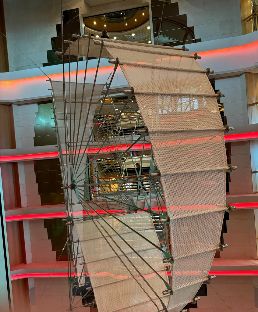 After the second set, we headed back to our cabin and got changed for dinner. We still had some time and decided to finish off the artwork on our deck. We had checked out the artwork between our cabin and the midship elevators as we went along, but we still had the area forward of our cabin and aft of the midship elevators to do on our side of the ship and all of the other side. There were some really nice pieces of art, but unfortunately the artwork on this deck was right by the light fixtures meaning that there was a reflection on most photos. I did get some photos. I also finally got around to taking a photo of the huge hanging sculpture in the Centrum. This spans decks 7 through 11, is a wire sculpture by artists Warren Seelig and Sherrie Gibson. This suspended, triple-arched geometric form, composed of architectural mesh and radiating spokes, is meant to create an emotionally uplifting feeling, according to Seelig. I am not entirely sure if it does this, but it sure is impressive. Once we had completed our loop of deck 8, we went downstairs for dinner.