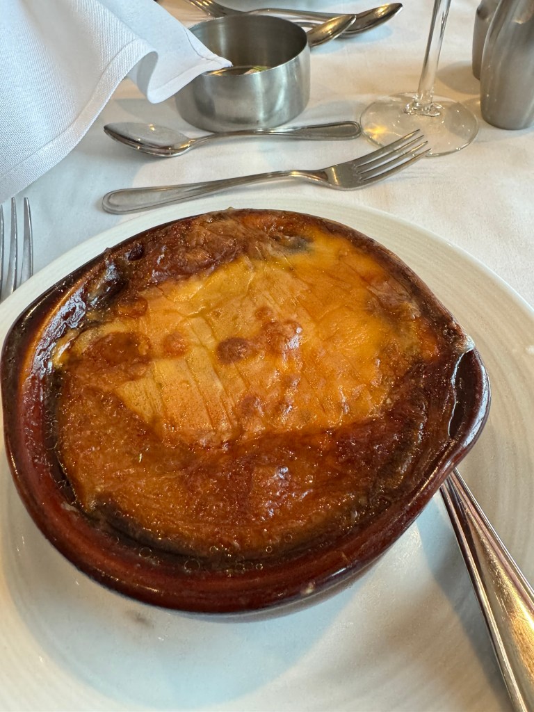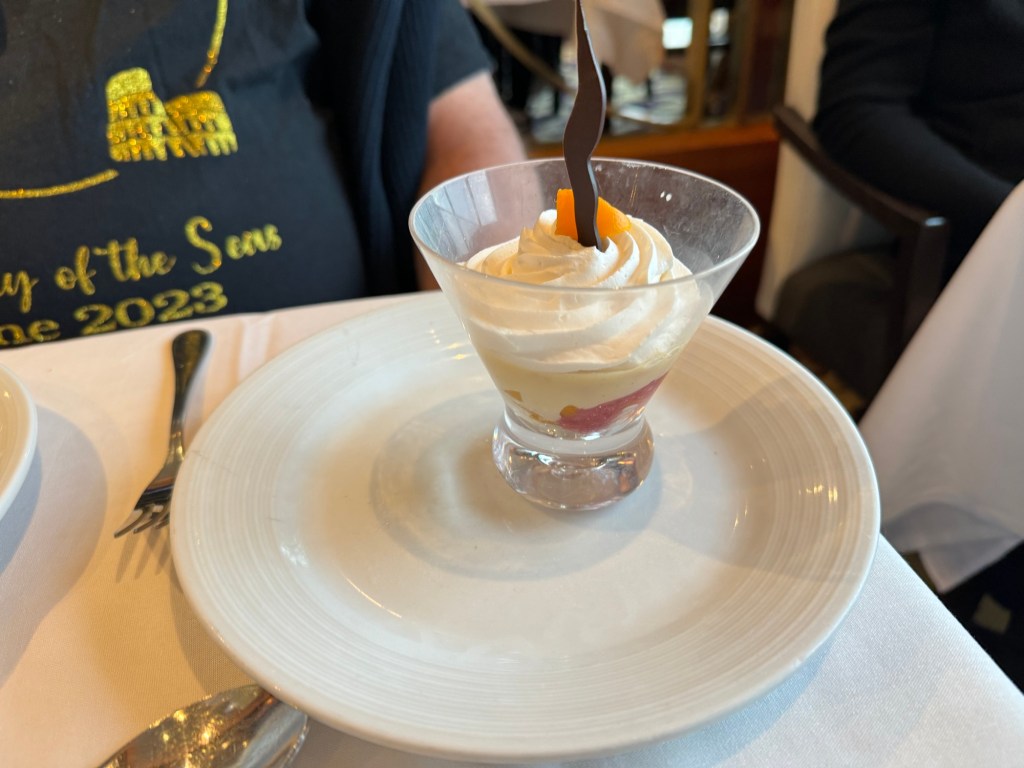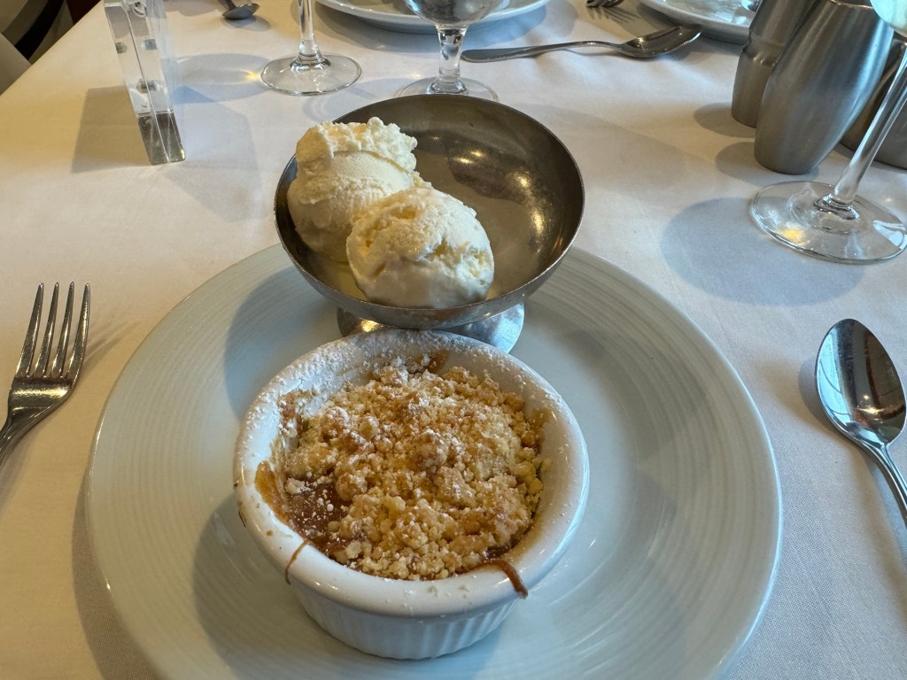 Dinner that night was the Bon Voyage menu. The menu on the first and last night of a cruise are quite similar. Graham started with the crispy seafood cake with carrot mango slaw and spicy garlic mayonnaise. I had the baked French onion soup. For his main course, Graham went with the autumn turkey dinner with mashed sweet potatoes, apple stuffing with toasted walnuts, sautéed corn and cider gravy. I kept it simple and had the spaghetti Bolognaise. For dessert, Graham had the peach trifle, and I had the warm apple cobbler with vanilla ice cream. We had our usual couple of glasses of Chateau St. Michelle Riesling with dinner. Then it was time to say goodbye to our dining team. They had been redeployed for the second cruise and we would have a different dining team.