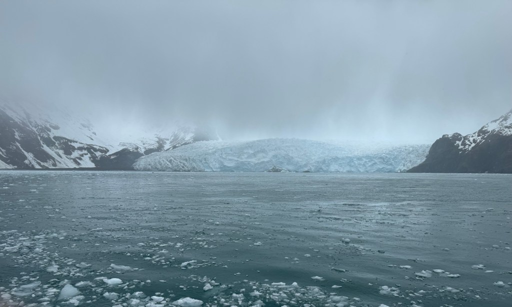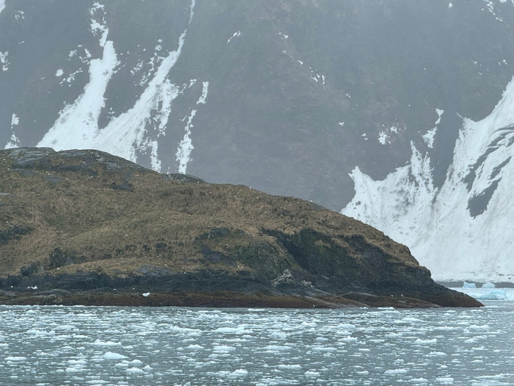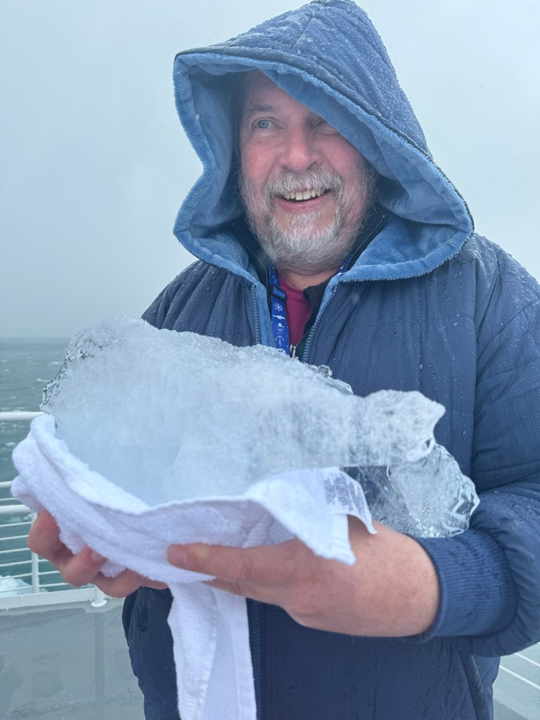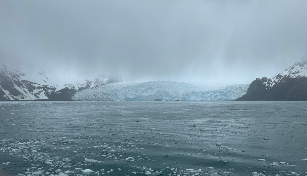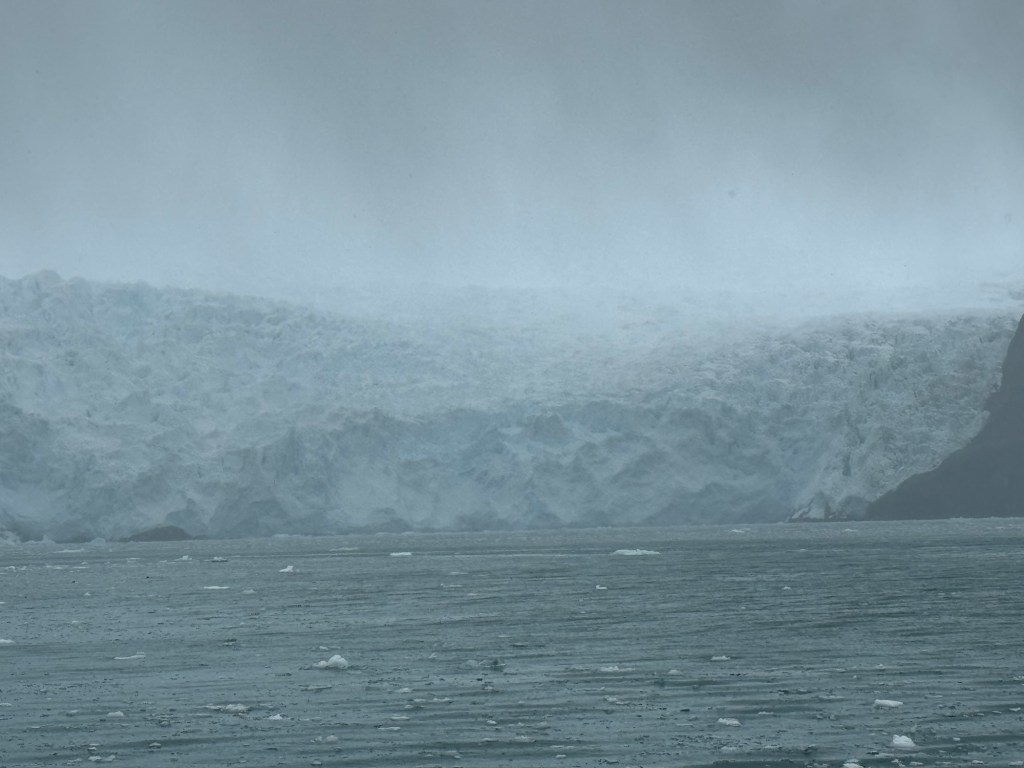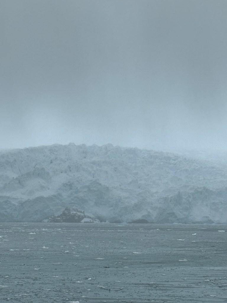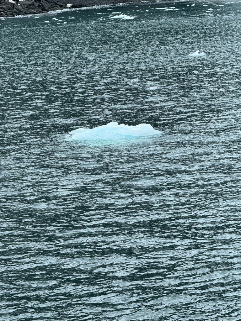 We reached the first glacier shortly after I got back upstairs. It was pretty overcast in that area and in the photos, it looks like the glacier is disappearing in fog, but to the naked eye, it was a clear view. Some of the crew went “fishing” for glacier ice. They got one large lump for show and tell. Graham was allowed to hold this for a while before it was taken inside. The other lumps they collected was turned into ice cubes for glacier ice margaritas, which they were selling at the bar.