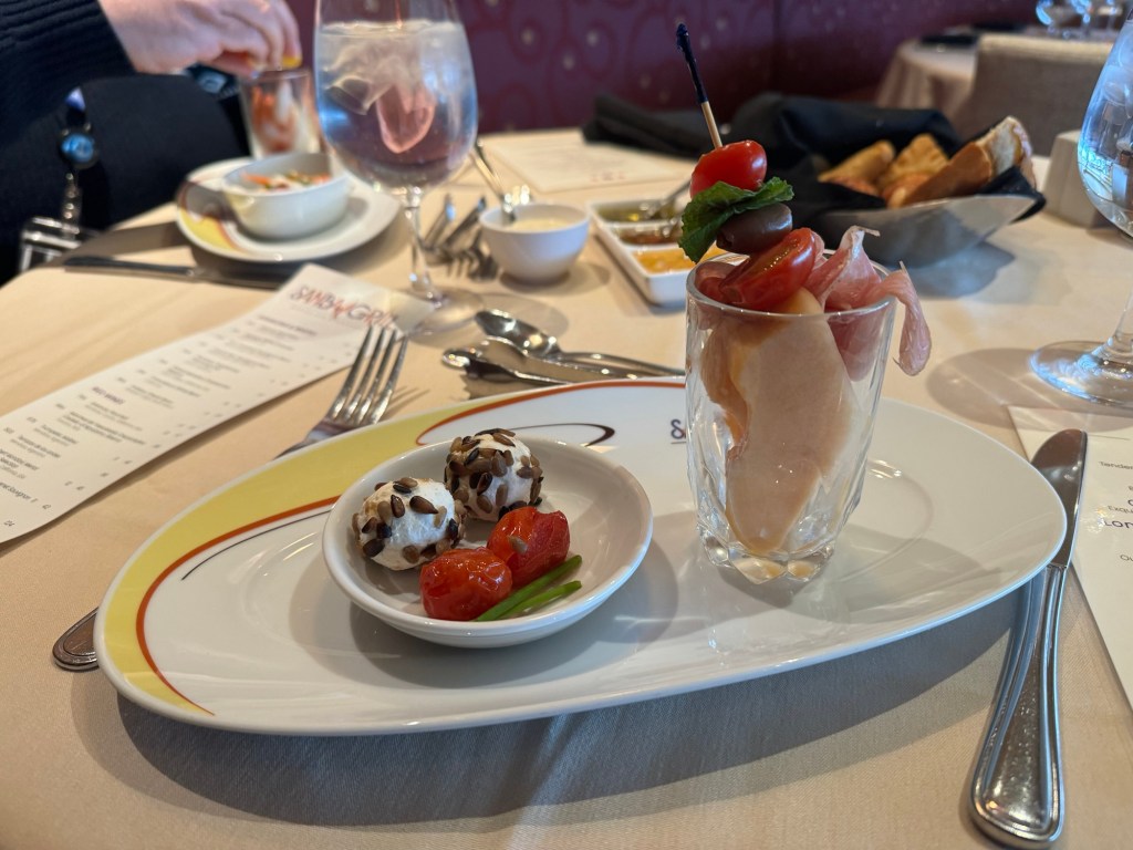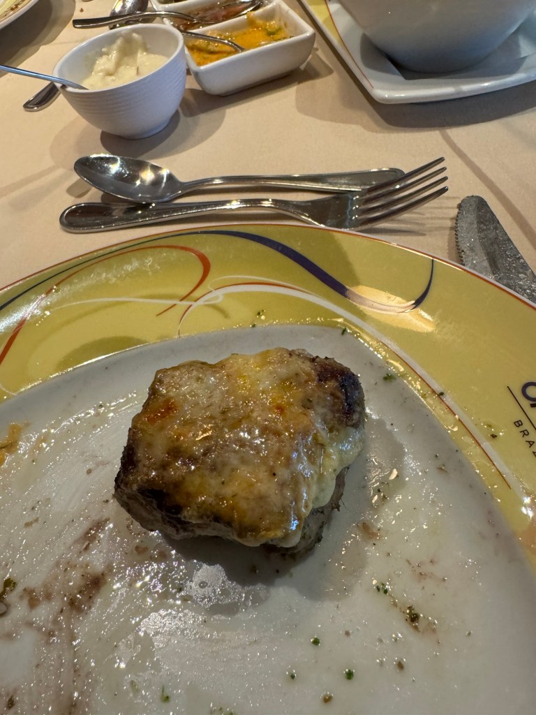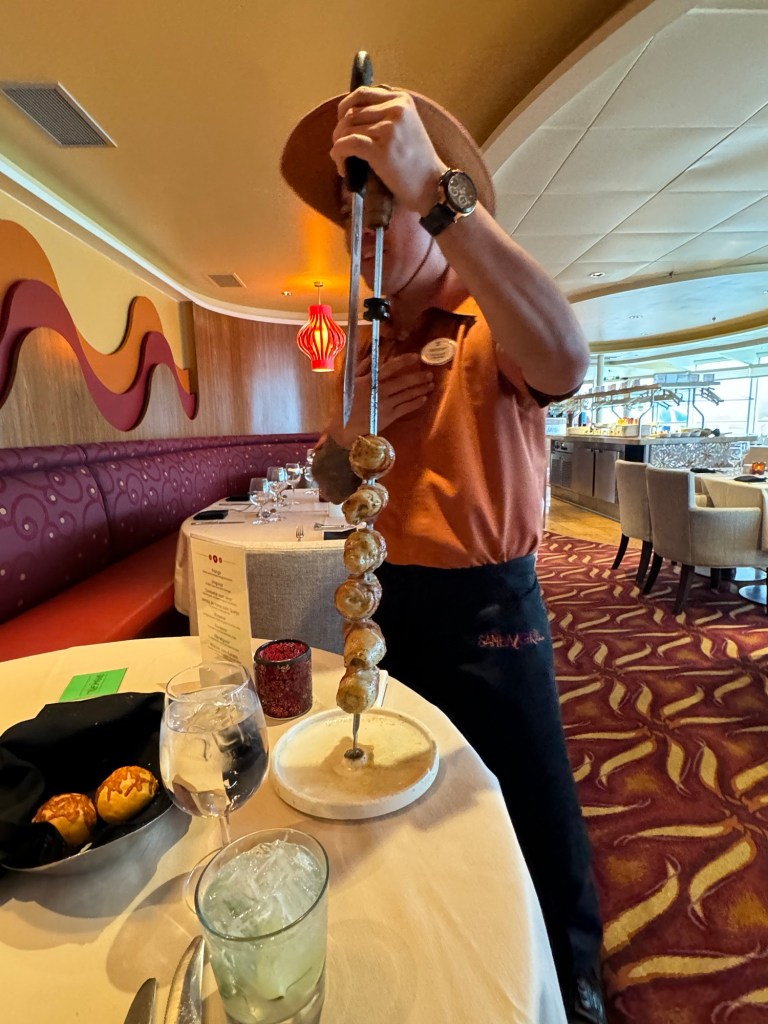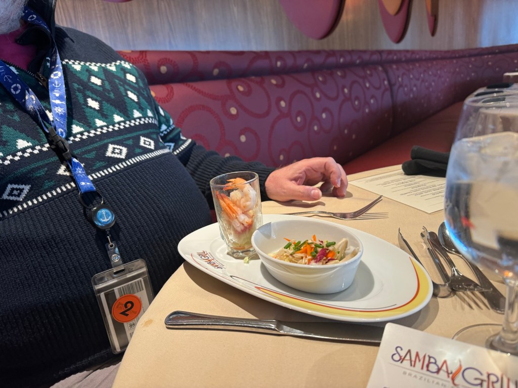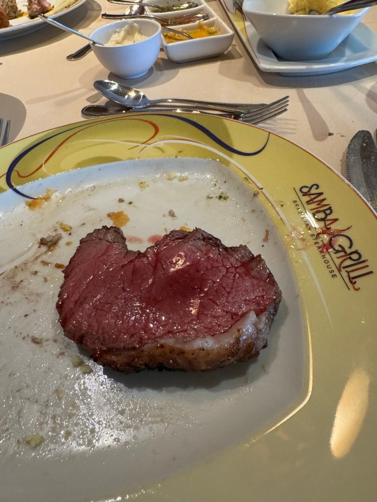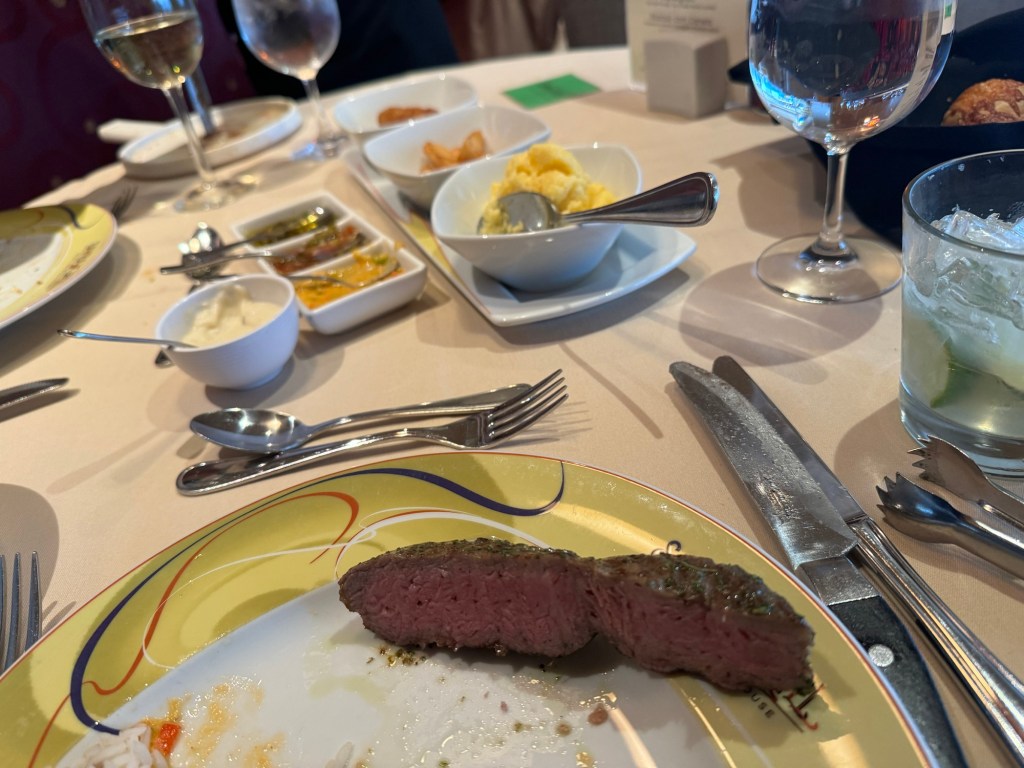 One of the perks that we get as part of our status is that we get buy one get one free at most speciality restaurants on the first two nights of the cruise. I really wanted to try Samba Grill, which is a Brazilian steakhouse concept that can only be found on Radiance of the Seas and Allure of the Seas. I decided to go and see if they had room for us. We got seated straightaway. Dinner and the service was amazing. They had a small buffet area set up with starters. Graham had a prawn cocktail and some kind of salad. I had melon with prosciutto and a vegetable skewer and some goat’s cheese. We were also given some cheese rolls with a hot cheese dip. I ordered a caipirinha, which was very nice and that was followed by a couple more. Graham had some Sauvignon Blanc. Our gaucho was from the Philippines. He brought us some dips and side dishes. I stuck to the polenta and Graham had the sautéed potatoes. Then the skewers started coming. The first round was bacon wrapped chicken breast. Next up was Brazilian pork sausage followed by garlic marinated strip loin. After this came my second most favourite dish, Parmesan crusted pork loin. After the top sirloin, I had a short reprieve while Graham and herb-marinated lamb chop. The last meat course was filet mignon and then it was time for my absolute favourite, roasted cinnamon pineapple. We both passed on dessert as we were ready to burst.