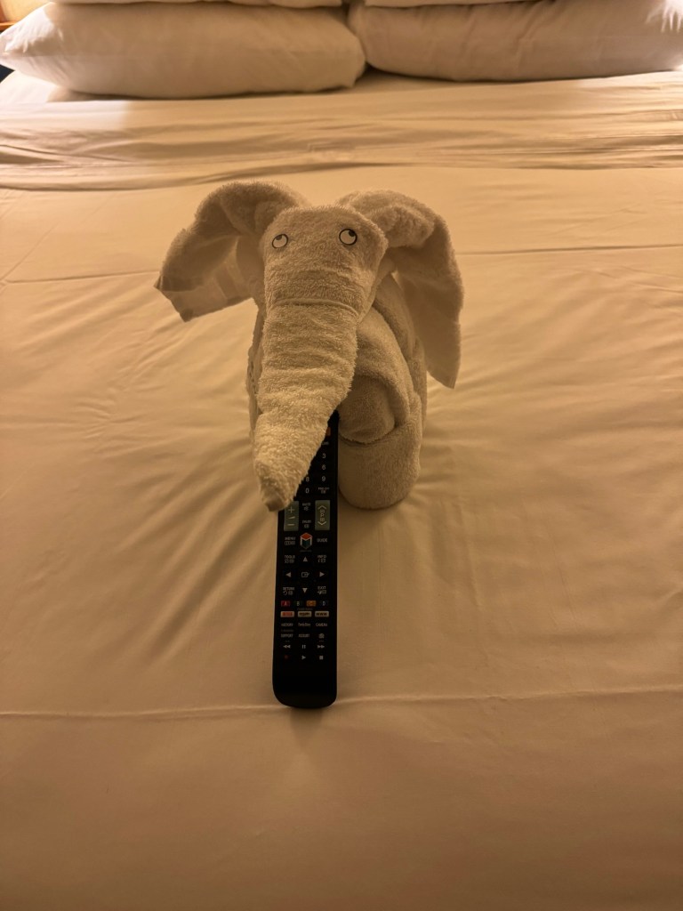 After trivia, we figured that some fresh air was in order. We went to the cabin to pick up some layers and found a new towel animal. We headed out on the promenade deck. Graham wanted to stake out potential viewing spots for later. He found some potential spots that had heat vents nearby. With this mission accomplished, we headed up to the Windjammer for lunch. We both had salad. Graham picked from some prepared salads, and I made myself a diy salad. After lunch, we headed to the solarium for some coffee. They had pistachio pound cake that day and I had a couple of slices of this with my coffee.