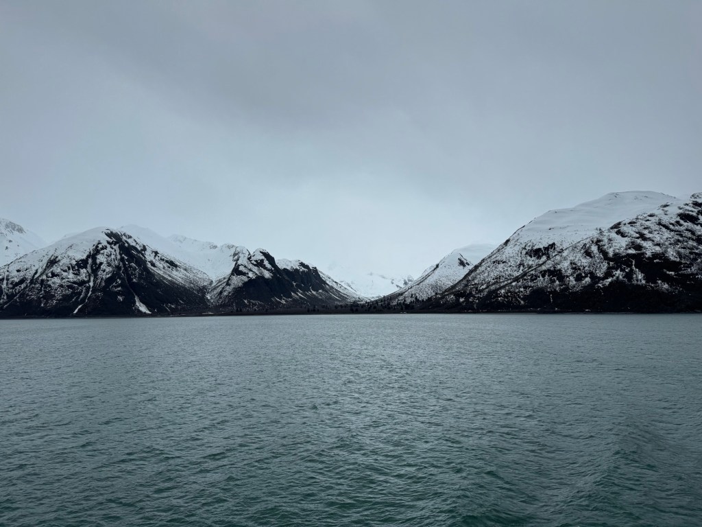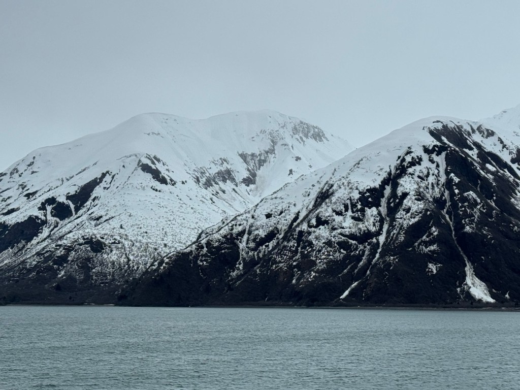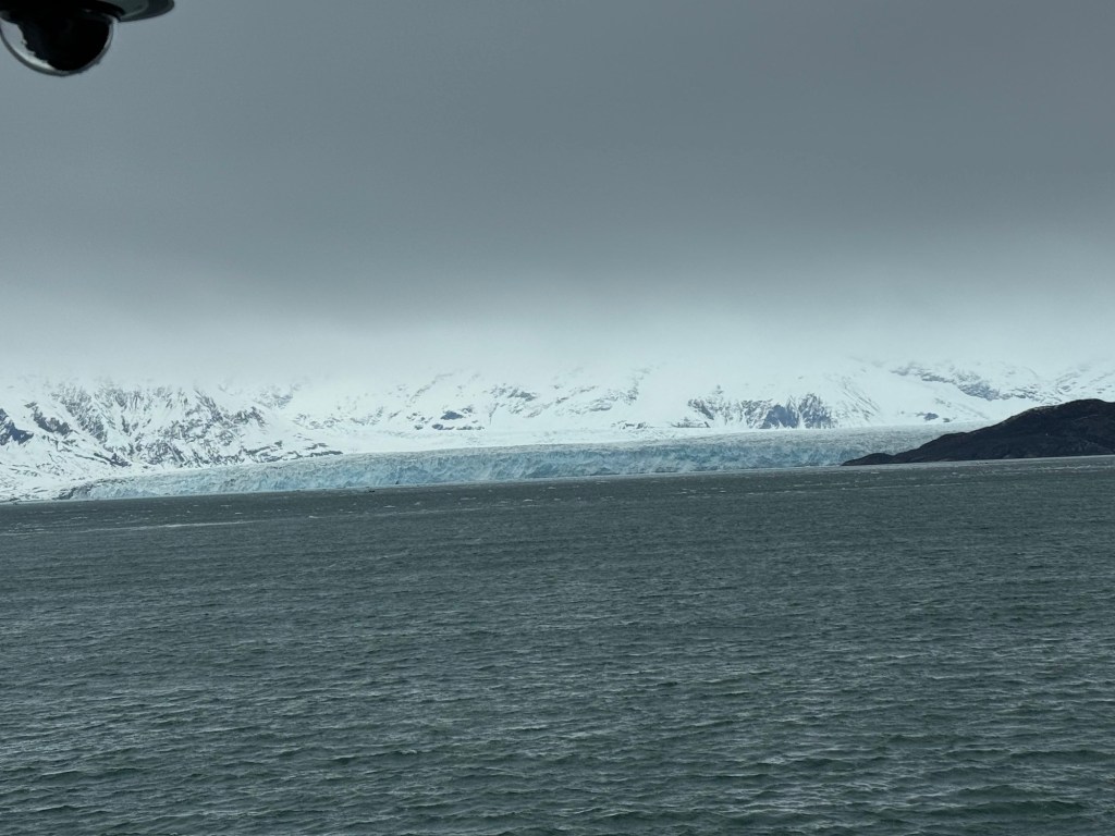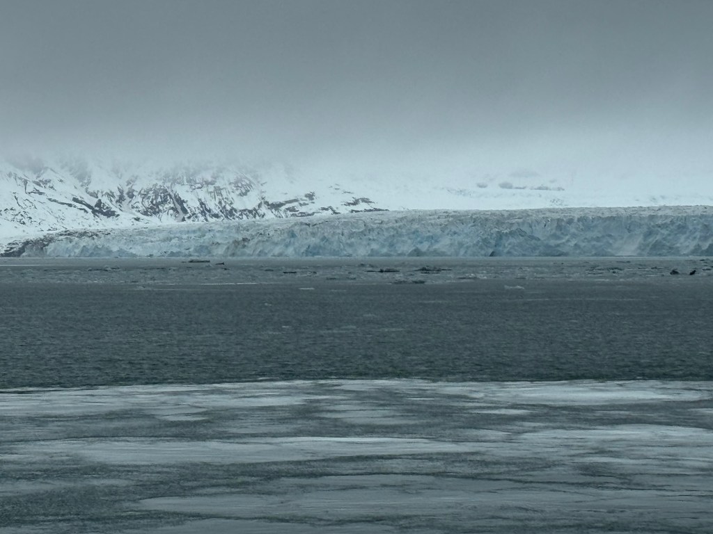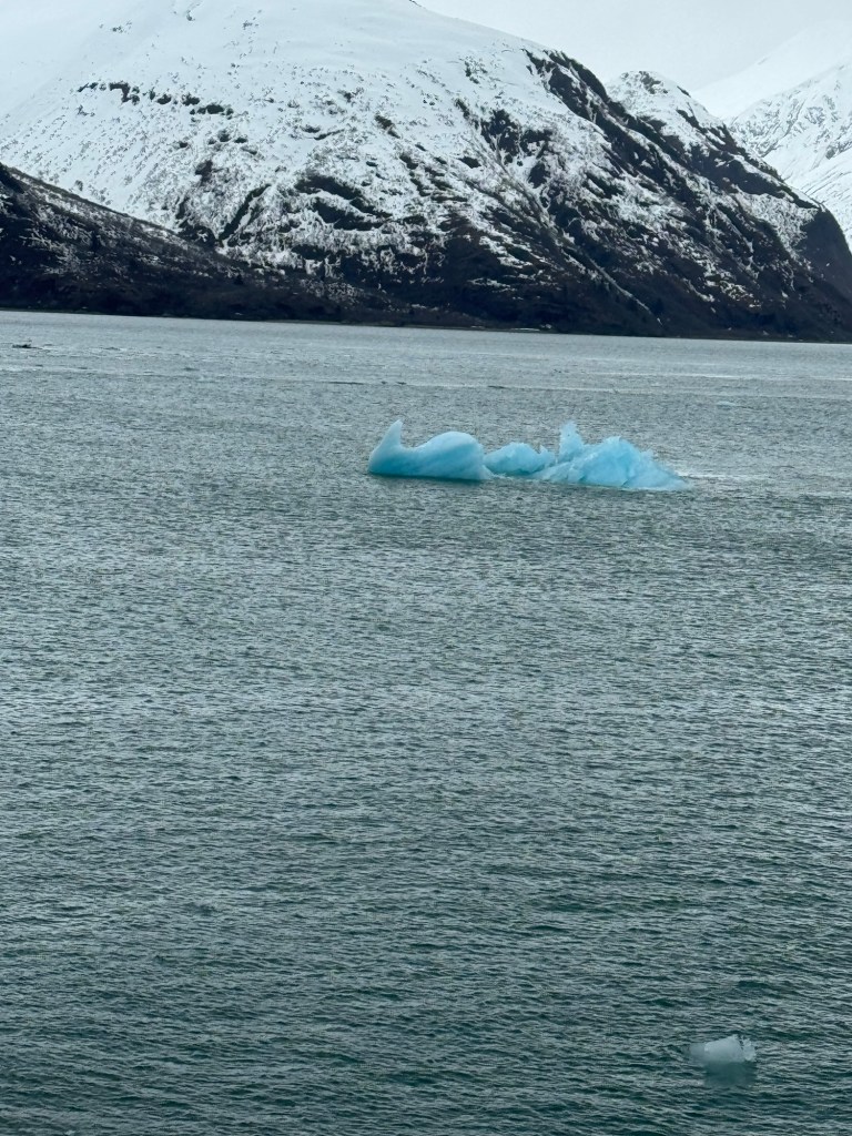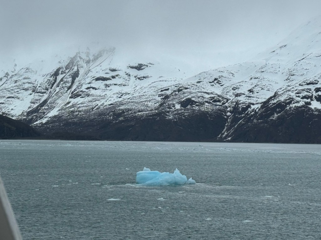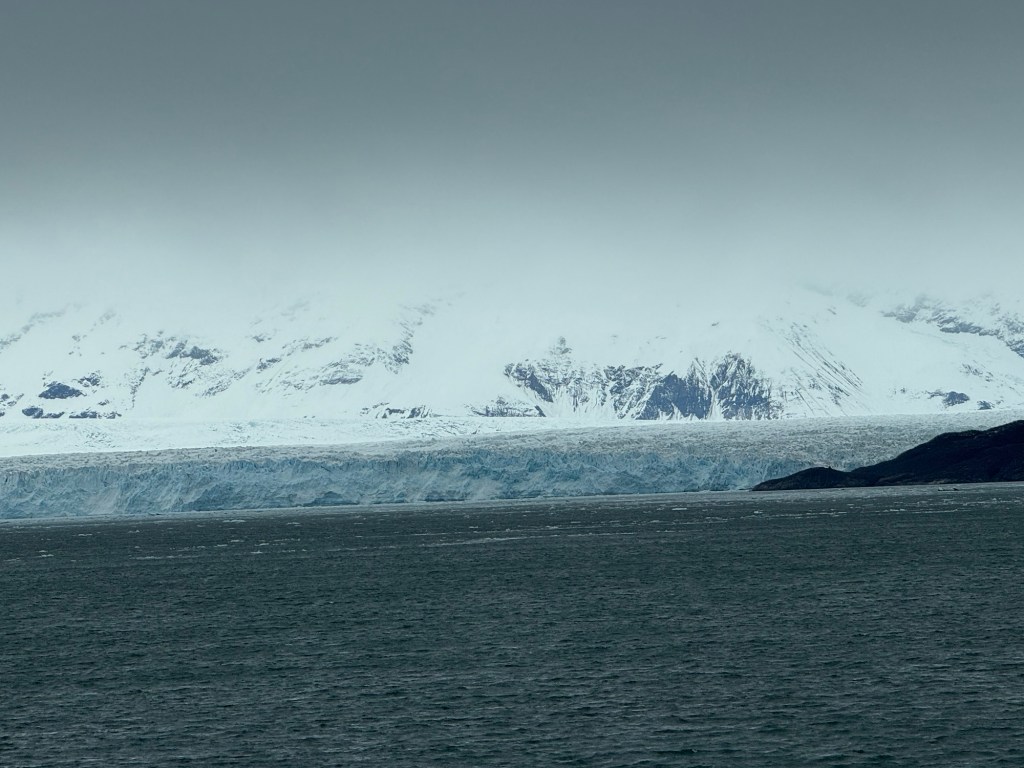 Once we had finished our coffee, we headed back to the Schooner Bar. However, Graham got restless and decided to go up to the cabin to get his telescope and then he would stake out a viewing spot. I figured that I would have time to do Disney trivia before we got close to the glacier. I asked Graham where I will be able to find him and then I settled down to read. Just before Disney trivia was due to start, I realised that we were much closer to the glacier than I had anticipated. I abandoned the idea of doing the trivia and headed downstairs to find Graham. I did not have to try very hard. It was pretty overcast, but it was dry, and the visibility was much better than on the way up. We also got a much better view at the sealion colony. I tried to take some photos, but even with the pretty spectacular zoom capabilities of my phone, this was too far away. The captain took his time, and we did a couple very slow turns so that everybody got plenty of glacier viewing time. At some stage a photographer came round. We were wearing our embarkation shirts just in case as we had missed out on photos the previous the day. It was shame that we were not facing the glacier when the photographer came by, but we still had some pretty scenery in the photo. There was more ice in the water this time round and I got plenty of photos with the beautiful blue glacier ice. This was when I was very glad that it was overcast. The vibrant blue of the glacier ice really stood out against the grey surroundings.