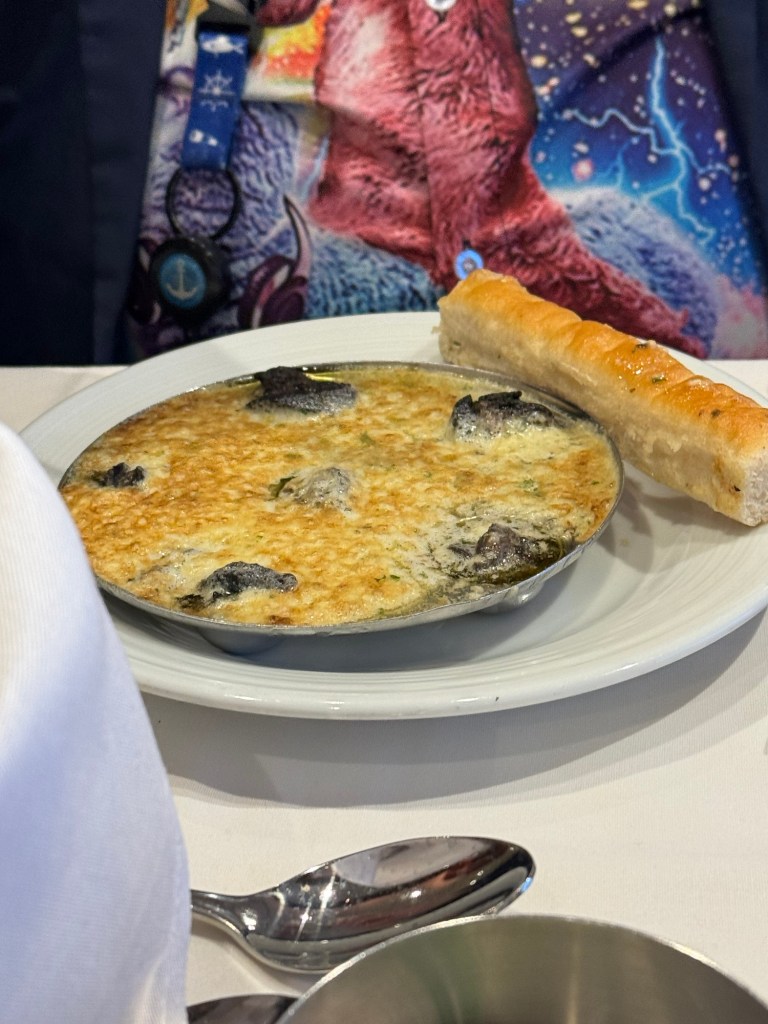 Dinner that evening was the A Taste of France menu. This week our table was more towards the front of the dining room and our dining team was even better than the one we had the previous week. Graham had the escargot for his starter, and I went with the iceberg wedge salad. For his main course, Graham went with the seafood linguine, and I had the Beef Bourguignon with white rice. For dessert, Graham had the warm apple cobbler with vanilla ice cream, and I had crème brûlée. We both had a couple of glasses of the Chateau St. Michelle Riesling. Dinner was very pleasant.