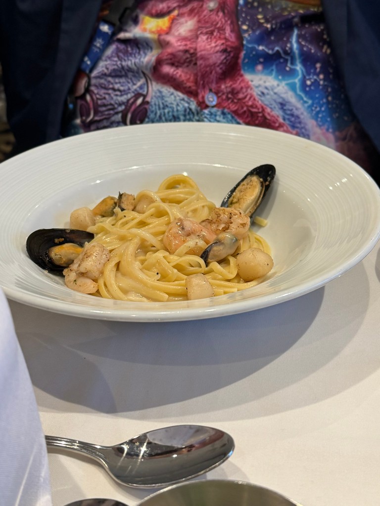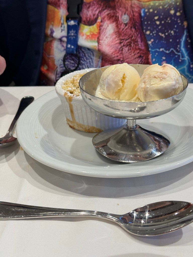 Even though I had not actually felt all that cold while we were on the promenade deck for the glacier viewing, I felt like I could just not get warm again once we were inside. We decided to head back to the cabin to defrost. On the way, we stopped by the shop and got a ship model, and I got a Spirit Jersey, which are the souvenirs that I like to get for each ship. Then we headed back to the cabin. I had every intention of just wrapping up in the quilt and reading. However, experience has taught me to always set an alarm when I do this. Sure enough, soon both of us were asleep. We must have needed it. Once the alarm went off, we got showered and changed and then we headed for dinner.