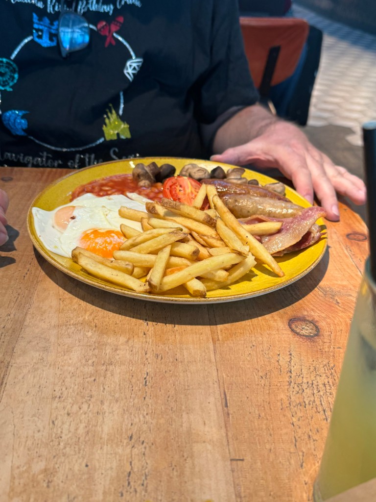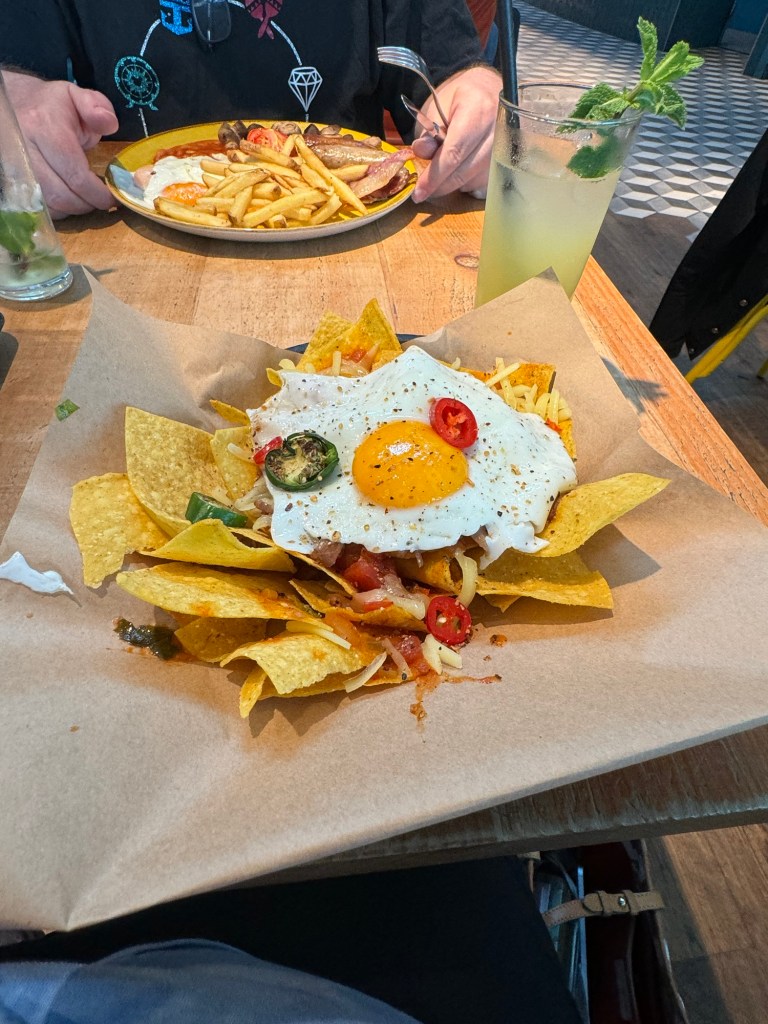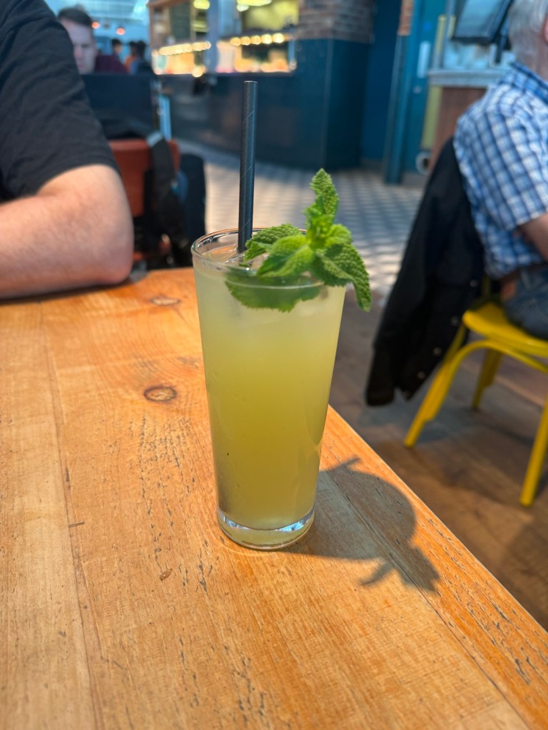 Just round the corner from security was a branch of Giraffe. They had quite and impressive line, but it moved quite quickly. We decided to have an early dinner. We stuck with the breakfast theme. Graham had the Giraffe Brunch Plate, which consisted of bacon, Cumberland sausages, mushrooms, roasted plum tomato, seasoned fries, baked beans and eggs any style. Graham went with fried eggs. I had he Huevos Rancheros, which consisted soft tortilla with mushrooms, black beans, Cheddar cheese, avocado, Pico de Gallo, Cayenne ranch and fried eggs. We were both happy with our choices. We both had the Sunshine Coast Iced Tea, which consisted of ice-cold chamomile and green tea with mango, lime and fresh mint. I was a little bit on the fence about this. I have disliked chamomile tea since childhood, but the rest sounded delicious. It was really nice and we both had a second glass.