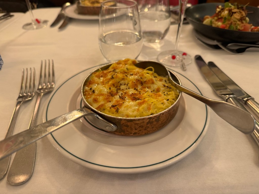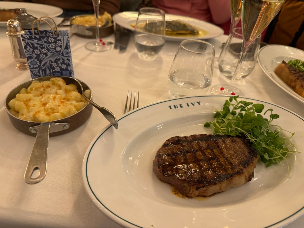 We were still one person short, but she arrived shortly afterwards. In the meantime, we perused the menus. We all decided on the autumn set menu that consisted of three courses and either a glass of sparkling wine or a non-alcoholic alternative. I had Truffle Taglioni, sirloin steak with macaroni cheese and Pistachio Nougat Glacé Flambé. The food was amazing, and the company was even better.