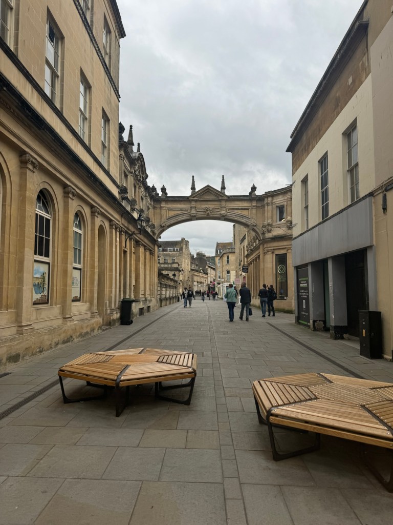 We both had knee issues. After a while of wandering around and enjoying our surroundings, we sat down on a bench and watched the world go by. Fortunately, it was a mild day. We found loads to talk about and I really enjoyed this. After a while, we continued our explorations. We checked out a beautiful art glass shop and my guide also took me to see Pulteney Bridge. Pulteney Bridge is one of the most photographed examples of Georgian architecture in Bath and one of only four bridges in the world to have shops across its full span on both sides. It is very impressive.