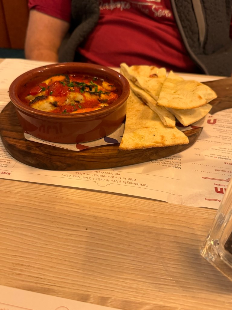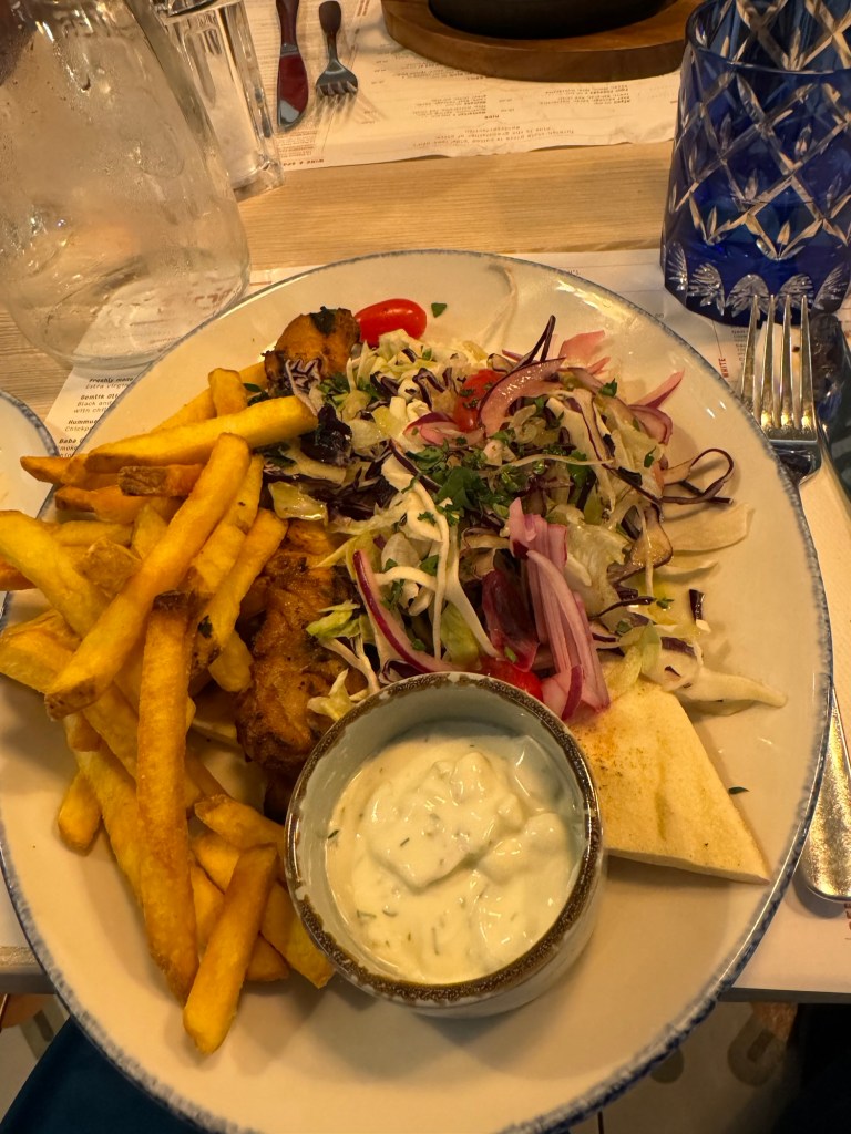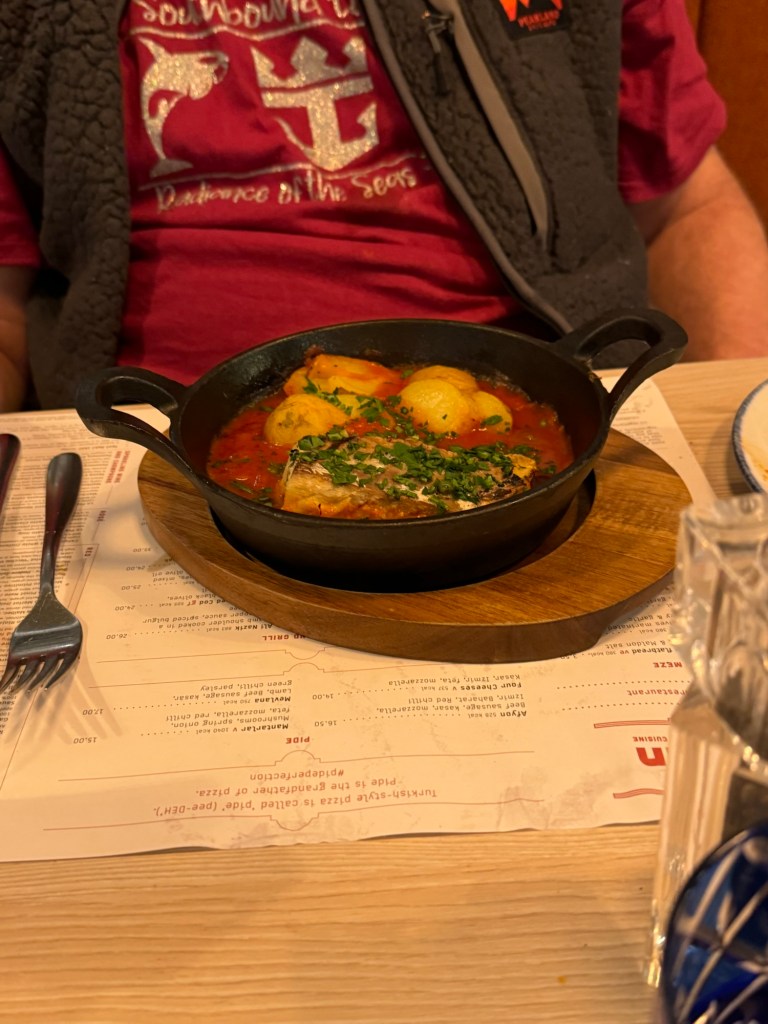 Soon it was time for dinner. We checked in at the podium and were seated. We had a bottle of White Zinfandel. We shared the baked haloumi with tomato sauce and flatbread. For his main course, Graham had the Turkish cod in a tomato and caper sauce with roasted new potatoes. I had the chicken shish kebab with salad and skin on fries. There was a lot of salad and Graham had some of this as well as the flatbread that came with my meal.
