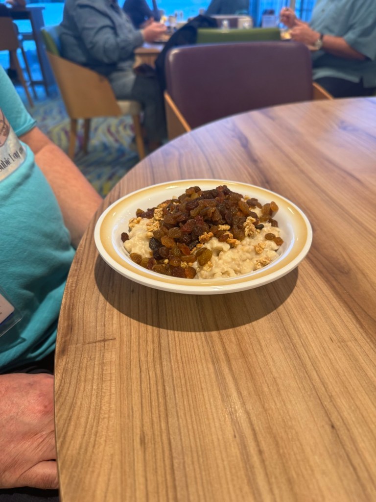 We were up again around 7:00 and headed up to the Windjammer for some breakfast. The weather looked promising, and this meant that we would head to one of my ultimate happy places, the monastery of Montserrat. First, we needed some food though. Graham started with oatmeal with dried fruit and sugar. He then had some fruit and a couple of Danish pastries. I had some plain congee with fried onion and bacon bits and a pear. After breakfast, we headed back to the cabin to get everything we needed for the day and then we headed down to deck 5 where the gangway was going to be that day.