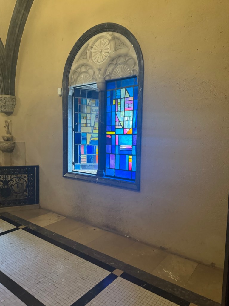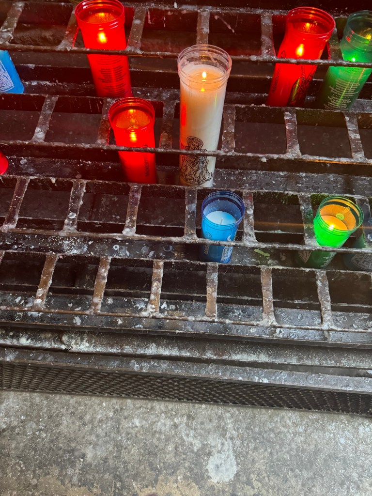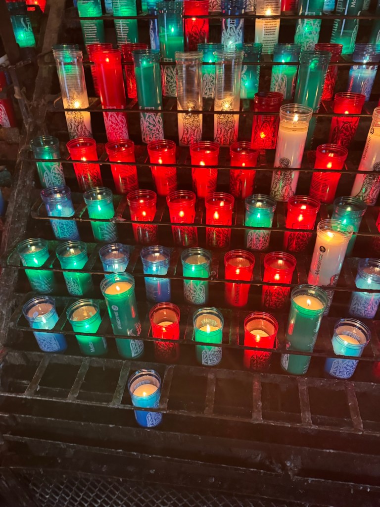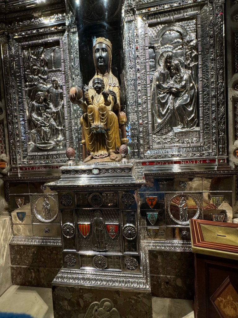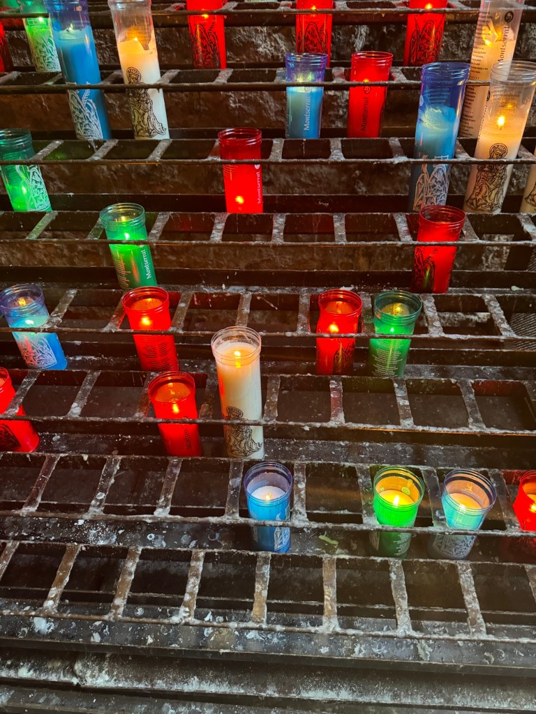 I exited onto the path of Ave Maria. This is a really magical spot. It is a space in between the wall of the basilica and the mountain. There are beautiful panels made from tiles in this area. There are also racks where people can leave candles. It amused me the previous year that the Roman Catholic Church had entered the 21st century and you can pay for the candles using contactless payments. I paid for a candle and lit it. One think that has always intrigued me is a statue that is in this area. I finally found out that it is The Angel of the Annunciation” by Apel-les Fenosa i Florensa.