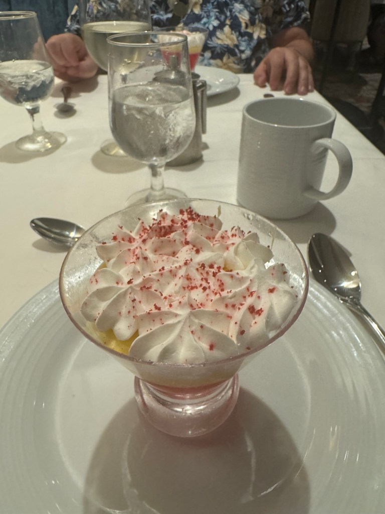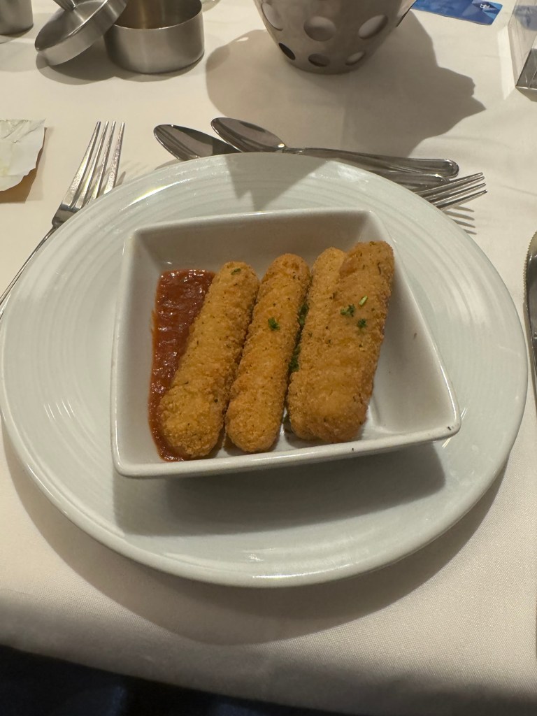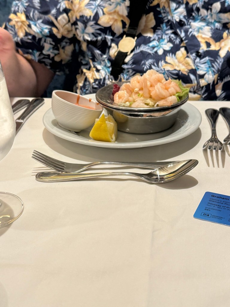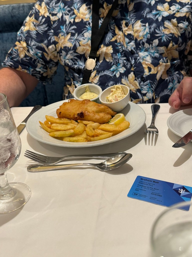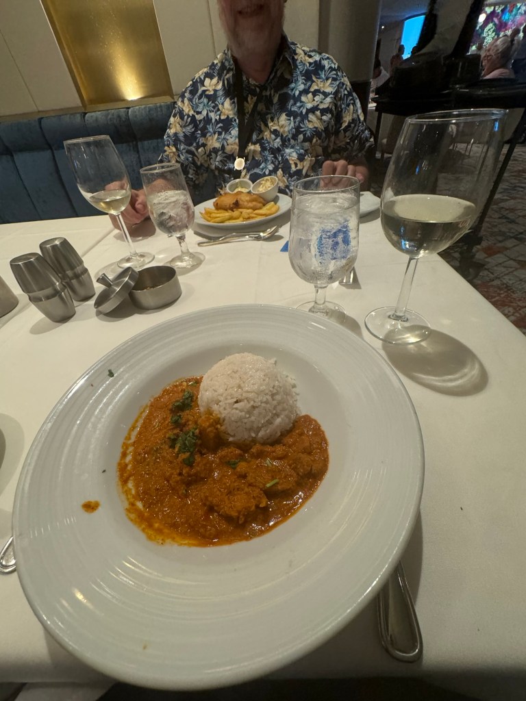 The menu that evening was A Taste of the UK. We had this on the Symphony of the Seas the previous year and were amused what supposedly is traditional food in the UK. Some of it is fairly accurate, but other additions to the menu are not. Graham started with a Shrimp cocktail, and I had the mozzarella sticks with Marinara sauce. For his main course, Graham had the traditional fish and chips, which came with proper thick cut chips, coleslaw, mushy peas and tartare sauce. I have never seen coleslaw served with fish and chips in the UK, but at least they now added mushy peas to this dish and Graham said that they were nice. I had the Chicken Tikka Masala. This sounds strange, but this dish was actually invented in the UK. It was delicious and came with basmati rice, roti and poppadom. For our dessert, we both had the English trifle. It was not terribly authentic, but it was tasty enough. We both enjoyed a couple of glasses of Chateau St. Michelle Riesling with our dinner.